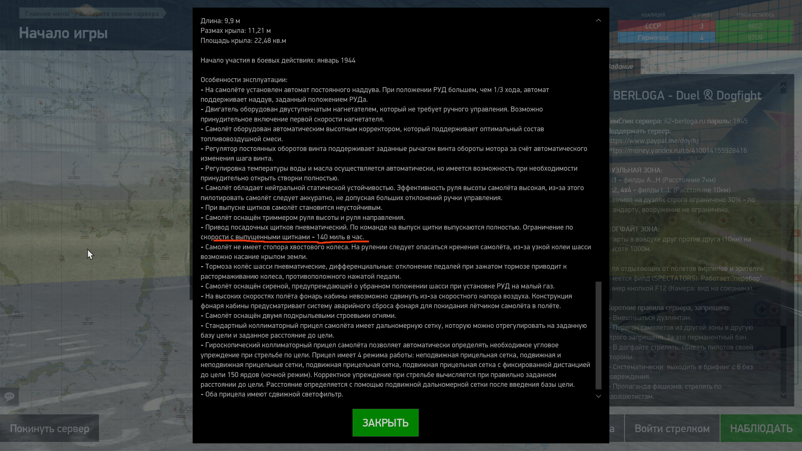 ArturoDiaz Опубликовано: 3 ноября 2021 Опубликовано: 3 ноября 2021 (изменено) Доброго времени суток. В карточе технических характеристик на самолёт Спитфаер 9 указана придельная скорость в пикировании - 725 км\ч. По факту Спитфаер пикирует лучше Мессера и даже Фоки, догоняя и перегоняю их на скоростях 800+ км\ч. Такое поведение самолёта можно встретить на серверах с хардкорными настройками (Пример Тактикал Аирвар). Спитфаер 9 без труда выходит из пикирования на скоростях 850+ км\ч (пробный вылет без каких-либо упрощений физики). Скрытый текст https://imgbb.com/tKXJntd https://imgbb.com/mb5P4br Скорость в 915 км\ч так же не становится критической. Лишь после 920+ планер начинает разрушаться. Скрытый текст https://imgbb.com/GM4BhQy Является ли это фичей, или это баг? Так же работает лётная модель для Спитфаера 14. Изменено 3 ноября 2021 пользователем ArturoDiaz 1