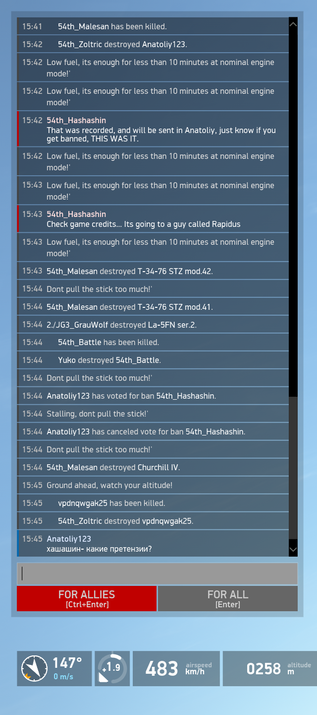 RC_Korban Опубликовано: 9 февраля Опубликовано: 9 февраля 21 час назад, 54th_Zoltric сказал: Anatoliy123 vote banning Hashash, Zoltric and Battle but didi not get a screen shot of Battle getting vote ban Anatoliy123 intentionally rammed 54th Malesan 8 time. When he comes into the server he rams over and over I have a recording of this and took screen shot of recording. I can send recording if you want Правила сервера Запрещено: 1. Оскорблять игроков 2. Атаковать союзные самолеты, технику, строения и т.п. Где нарушение правил?