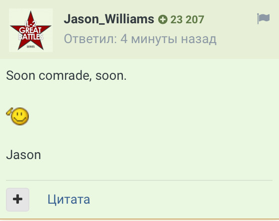 Eeafanas Опубликовано: 13 сентября 2020 Опубликовано: 13 сентября 2020 (изменено) 5 часов назад, 49Anatoliy-P сказал: Нет в том чести. Мы танкисты и для нас честь в воздухе - Филькина грамота) Сегодня кстати наш профессиональный праздник. А ещё я спросил у Джейсона в ЛС насчёт ЗСУ... вот его ответ: Изменено 13 сентября 2020 пользователем =5GIAP=Eeafanas