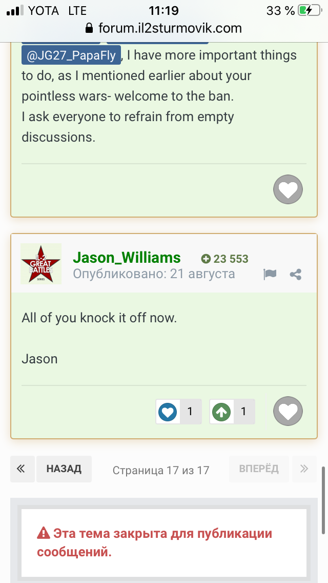 =5GIAP=Dammy Опубликовано: 30 сентября 2020 Опубликовано: 30 сентября 2020 (изменено) Ясно, я очень разочарован в вас после услышанного. Вместо того что-бы дать ясный ответ, просто установи удобное правило, по-которому к тебе нельзя даже подобратся, вдобавок удалив мой пост, это очень мерзко. Думал что раз дядьки взрослые так не ведут себя как дети, избавляясь от тех кто мешает им игратся в песочнице, и строить замки из обоссаного песка) У меня есть пруфы о причине бана (по понятным причинам, и правилам форума я не могу их кинуть) Но это говорит для меня о многом. Впредь ни за что не зайду на этот сервер, а вдруг забанят по приколу, от балды, верно? Друзьям о сервере буду негативно отзыватся. А если вы ещё и подумали мол : "Ну ладно, одним меньше" То мне действительно жаль за прогнившую слойку комьюнити этой игры - ведь это отображает ваши эгоистичные и прогнившие личины, который скрыты за старыми манерами, и разными высказываниями.) Удачи вам вместе со спайкером весь сервер разгонять, особенно спайкер, ты знал что если гонятся за ла5фн на высоту на 110, и не догнать её - это не её пилот читер, а ты тормоз. Всего хорошего, adios. (Не удивлюсь если и этот пост удалите - опять себя покажите)) Изменено 30 сентября 2020 пользователем =5GIAP=Dammy 2