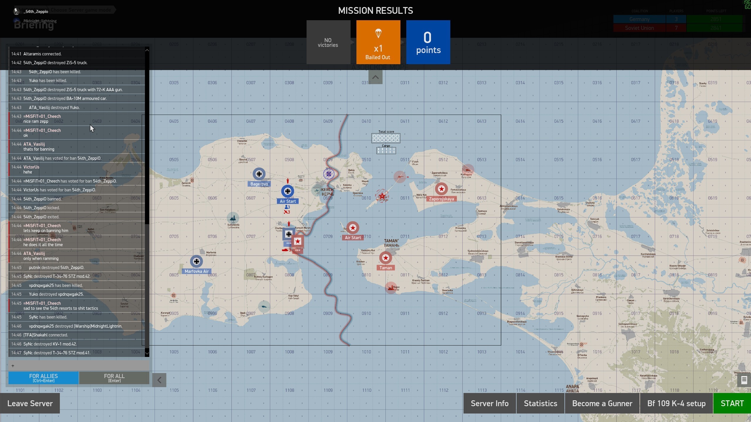 [Warship]MidnightLightnin Опубликовано: 15 сентября 2023 Опубликовано: 15 сентября 2023 I have some sympathy with the above concerning the voteban button. New pilots coming into the server have no way of knowing about the ban on its use. I understand it may be difficult to remove the button but surely it is possible to put some clarifications within the Map Briefing which could include: Don't use the Voteban facility - doing so will get you a ban Ramming of player or AI vehicles/boats is Forbidden (or not?) - Occasional accidental collisions are unavoidable but persistent ramming will not be tolerated. (If someone is doing this persistently then take videos and submit to admin). Shooting Parachutes is not allowed (or is allowed?) Killing players on the ground/runways is permitted (or not?) Exiting, or bailing out of an undamaged plane, whilst in combat is forbidden and may result in a ban (This is a major area of cheating by two pilots on this server (both currently banned)) Leaving the map area to avoid combat is forbidden. etc That way everyone knows the rules of the server. 18 hours ago, VictorUs said: Good day. I haven't come here for a long time, the need forced me. And then the horrors are happening. When you have time to fly off at least one card, you can't see it. Necessity forced. Dear admins, I can't log in to the server. Yesterday I successfully flew off, had no comments, did not enter into skirmishes, although the blue brothers provoked, I did not get into my own. I can't go in today. I ask you to explain what the reason is, what mistake you made (if), how to correct it. Regards. Victor Us, you say you "had no comments" but I think laughing at Vasilij vote banning Zeppio is not great.