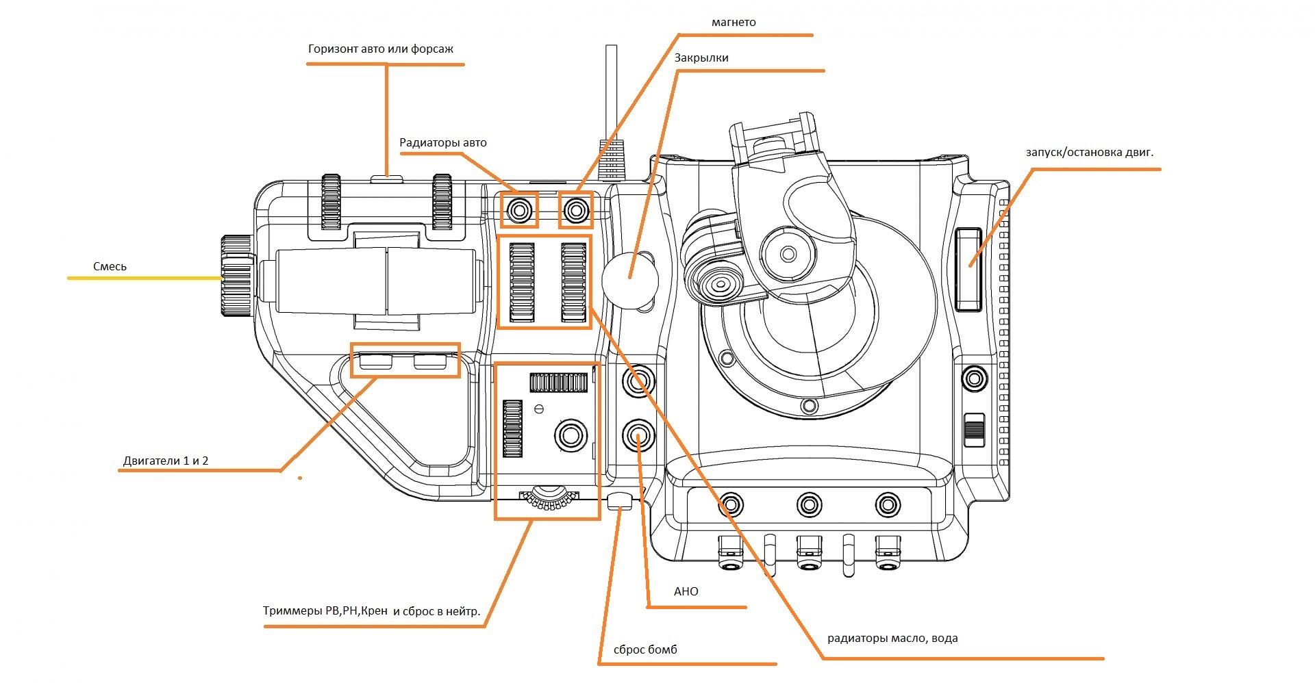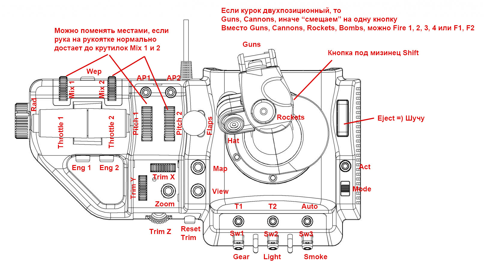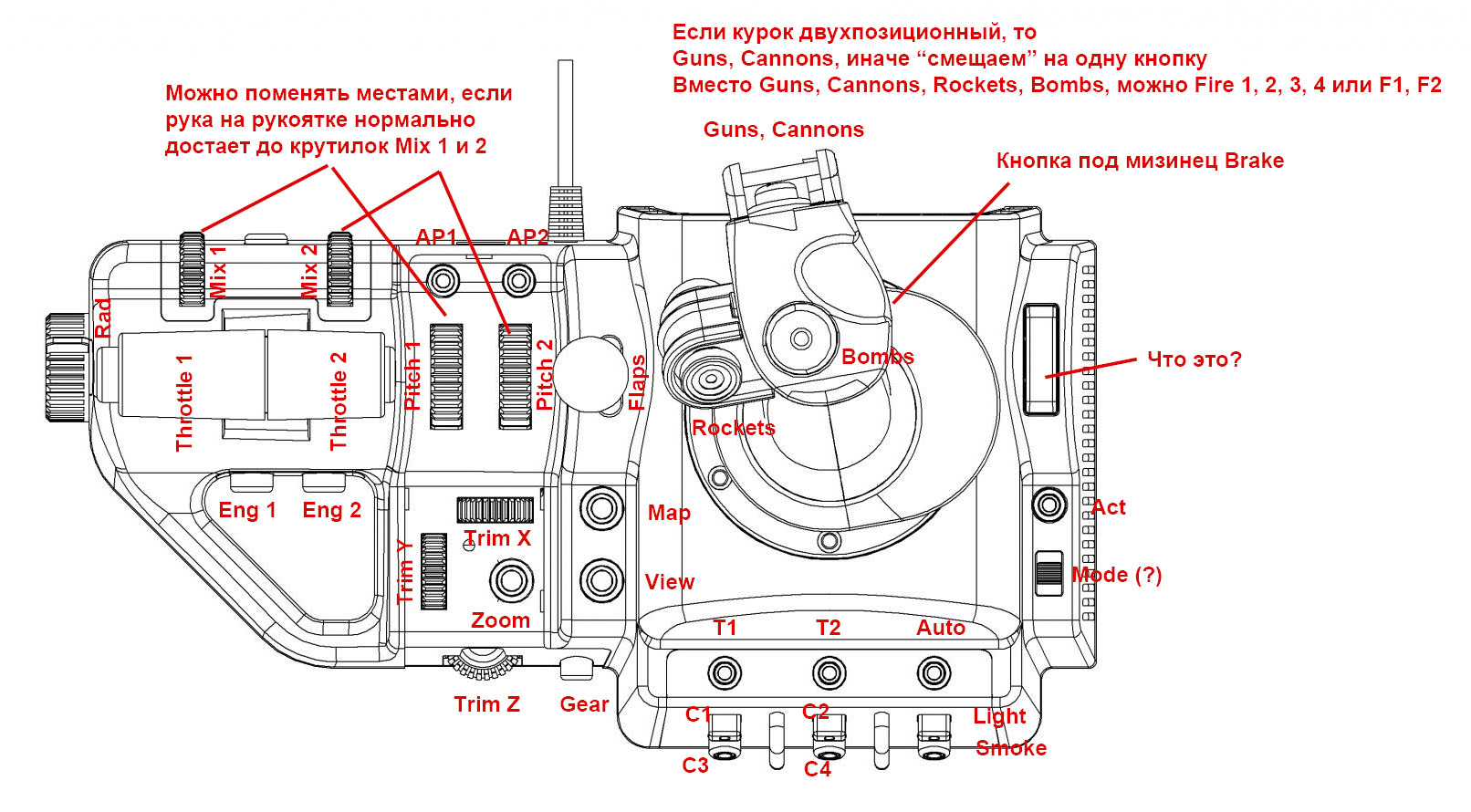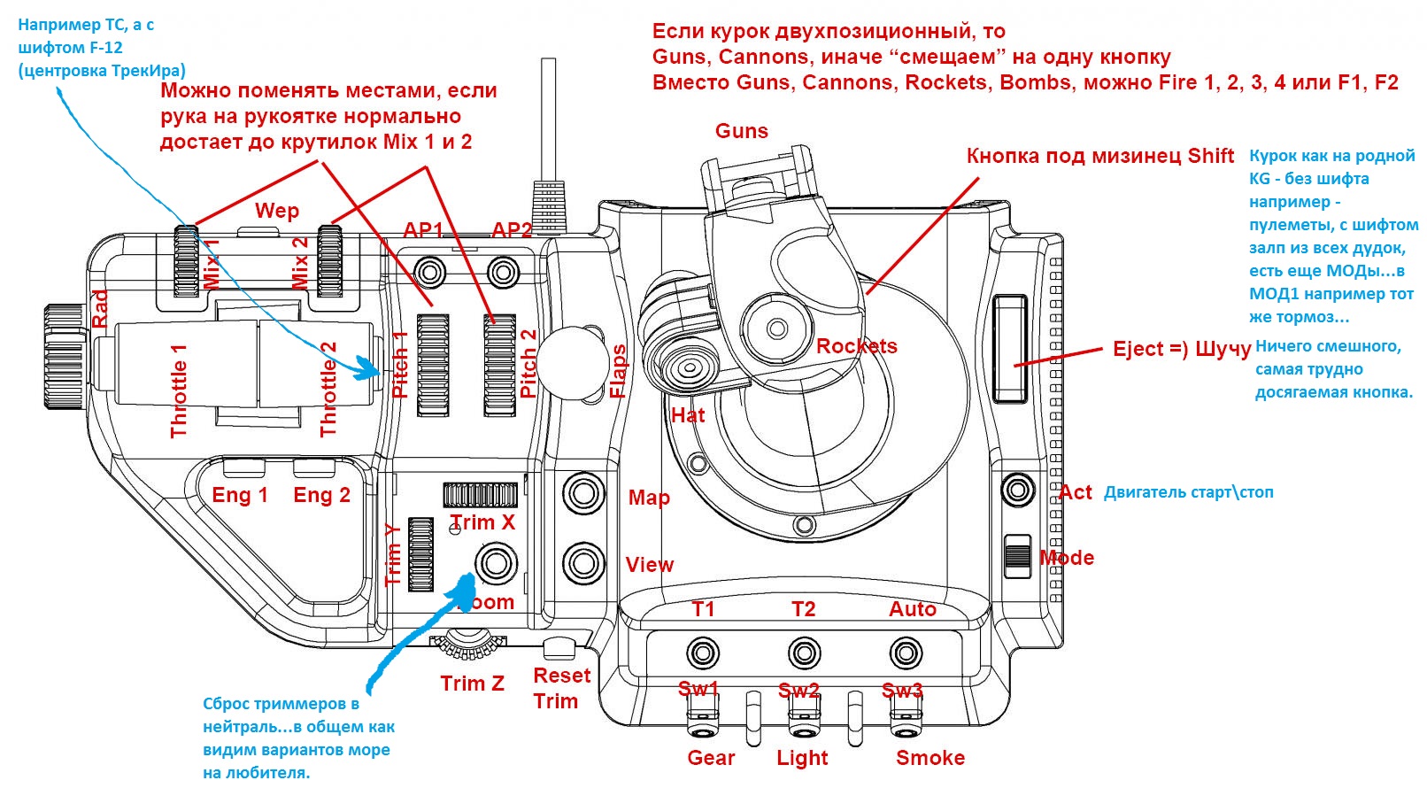 Harh Опубликовано: 7 марта 2015 Опубликовано: 7 марта 2015 Хатка это то что ты принял за кнопку и назначил туда Ракеты Впереди энкодеры, "что это" - кнопка, большая и красная. Кнопка под мизинец лучше как шифт имхо использовать - дает из двух кнопок оружия - четыре.. МОД - угадал. Оси слева направо - смесь,шаг,наддув, два радиатора. Три оси на РУСе...итого 8. Триммера - энкодеры. Все остальное кнопки, включая рычажек между блоком РУД и РУС, по факту это две кнопки с возвратом в центр...я думаю закрылки будут тут в самый раз. Курок ОДНОПОЗИЦИОННЫЙ как на реальной ручке был. Тогда немного меняем... Если триммеры не имеют границ, то да, надо сброс триммеров. Но есть нюанс, который хардкорным вирпилом будет непонятен: под рукой должны быть "искусственные" кнопки вроде смены вида, карты и т.д. Они реально вполне используются, потому под любыми благовидными предлогами должны быть назначены по-умолчанию на кнопки под рукой. Потому я вместо Reset Trim X, Y, Z туда предлагаю по-умолчанию назначать совсем другие функции вместо вроде бы очевидных А на триммеры назначаю только одну кнопку. Обычно используется схема выделения одного двигателя с пуском его, здесь же получается полностью раздельное управление двигателями. Тут я просто оставляю так, пусть в реальной игре это не будет полностью соответствовать действительности и те же оси могут быть назначены по-другому. Сама идея использовать шифт для оружия мне не нравится, но если народ пользуется реально, почему нет. Немного изменил схему. Оси оставил без изменений.