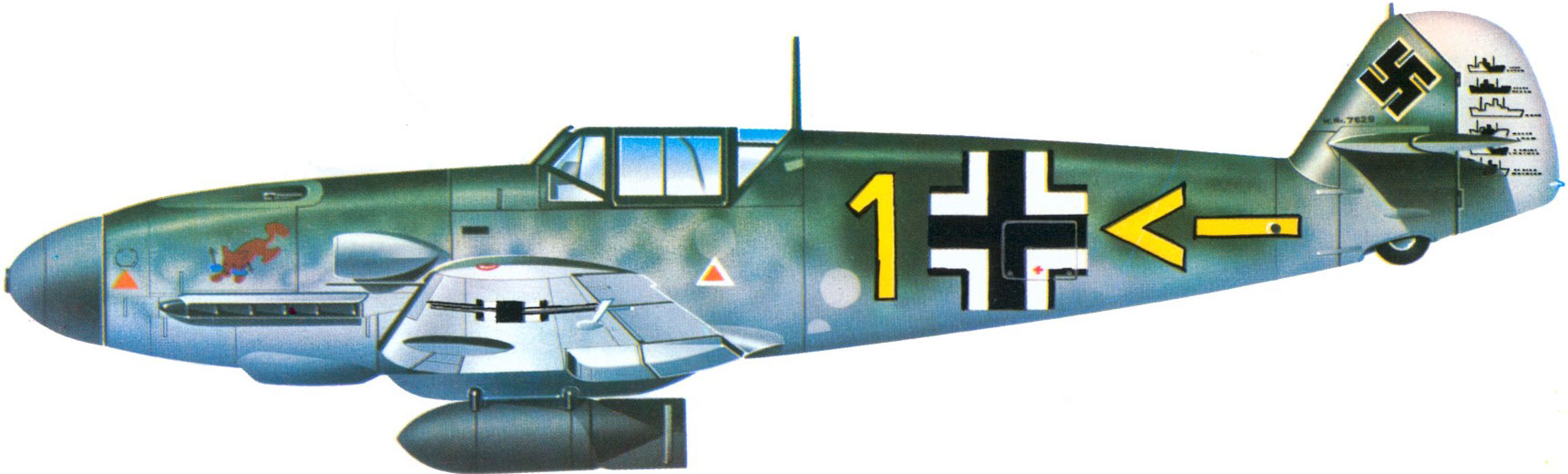 Wotan Опубликовано: 20 декабря 2016 Опубликовано: 20 декабря 2016 Получилось интереснее. Маркировка на машинах 10.(Jabo)/JG2 была синяя - это отражено в списках потерь, где кроме прочего пишут тактическое обозначение самолёта. РН на этой машине был скорее жёлтый, хотя их на ней было либо два из-за замены, либо он перекрашивался. Кораблики на РН фона не имели, были выполнены только чёрным. Совсем недавно обсуждали: http://scalemodels.ru/modules/forum/viewtopic_t_66562_start_0.html