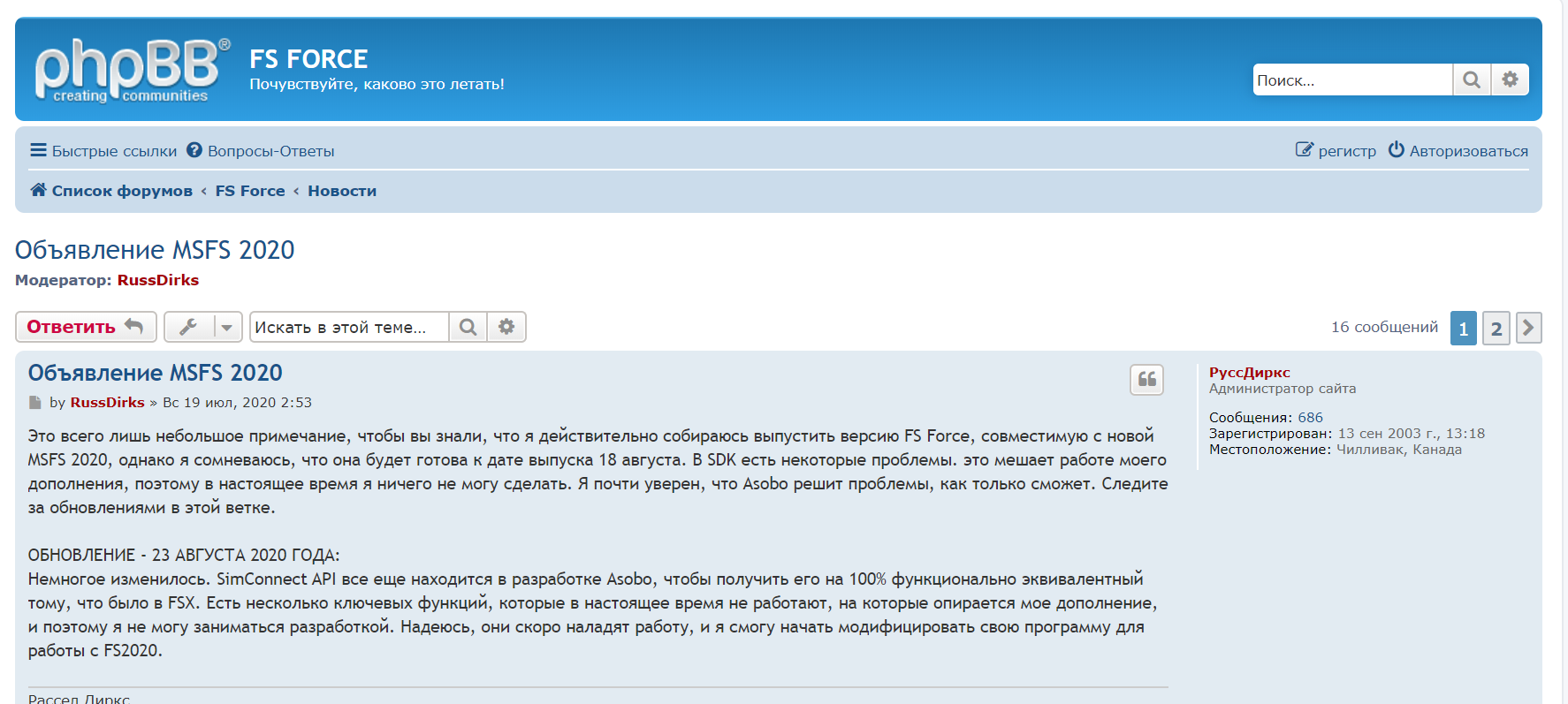 ABP_158 Опубликовано: 24 августа 2020 Опубликовано: 24 августа 2020 8 часов назад, huligan сказал: SimConnect где то должен отключаться? SimConnect API все еще находится в разработке Asobo https://www.fs-force.com/forum/viewtopic.php?f=11&t=1468 17 часов назад, DeadlyMercury сказал: В упор не вижу настройки... Сорри,поторопился немного.Вот информация: https://www.fs-force.com/ https://www.fs-force.com/forum/viewtopic.php?f=11&t=1468 27 числа патч,может добавят. 1