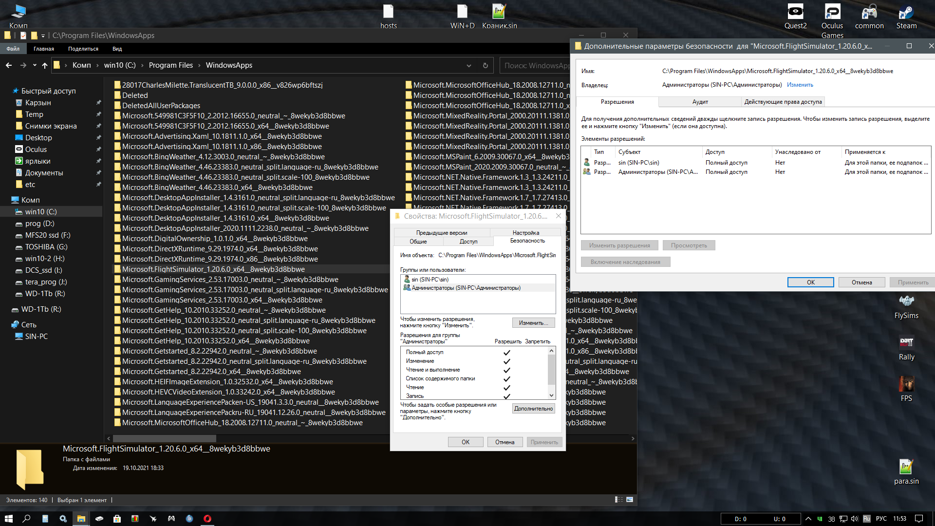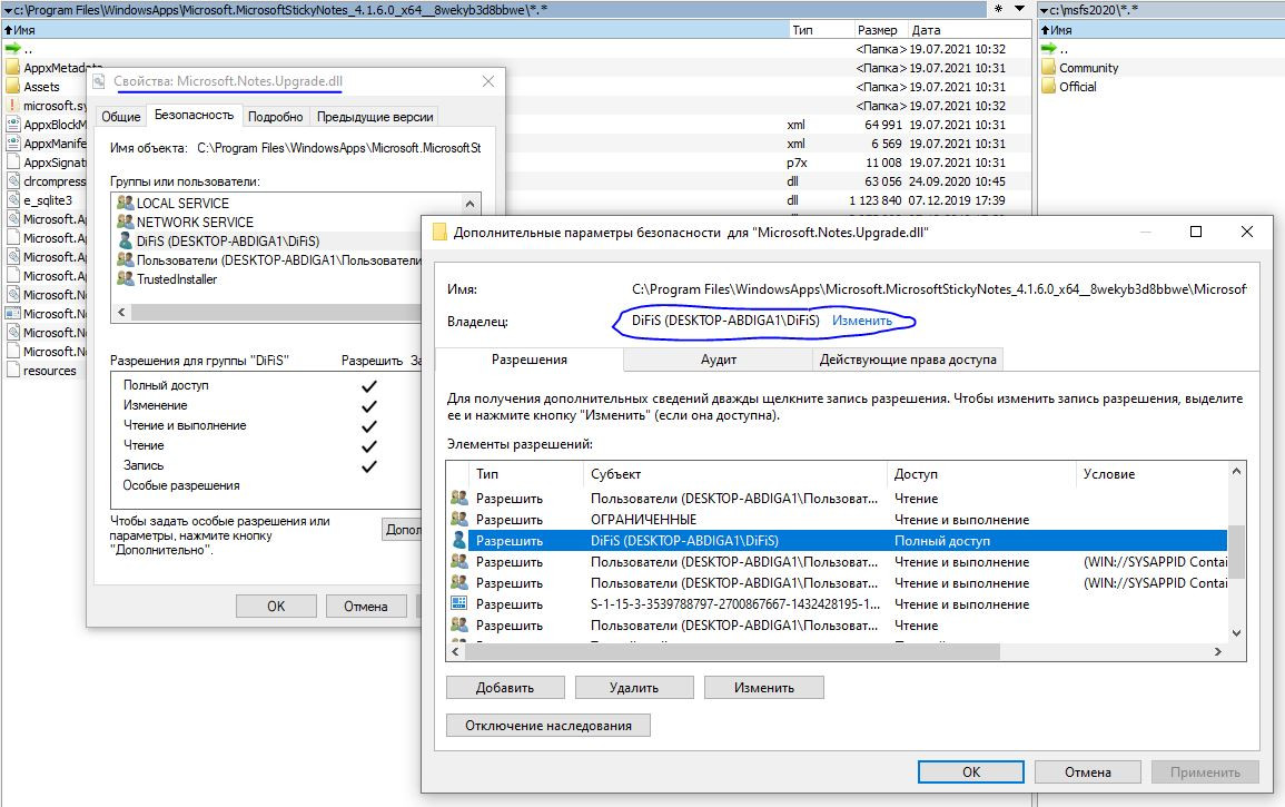 huligan Опубликовано: 31 октября 2021 Опубликовано: 31 октября 2021 (изменено) 30.10.2021 в 09:48, DiFiS сказал: Зайди в свойства файла в безопасность и смени владельца файла да делал это-не помогает! я там и так уже владелец,но полные права себе дать не могу,кнопки там все серый неактивные:((( при этом к папке Microsoft.FlightSimulator_1.20.6.0_x64__8wekyb3d8bbwe полный доступ имеется,а к папкам и файлам внутри-нет и невозможно изменить Изменено 31 октября 2021 пользователем huligan