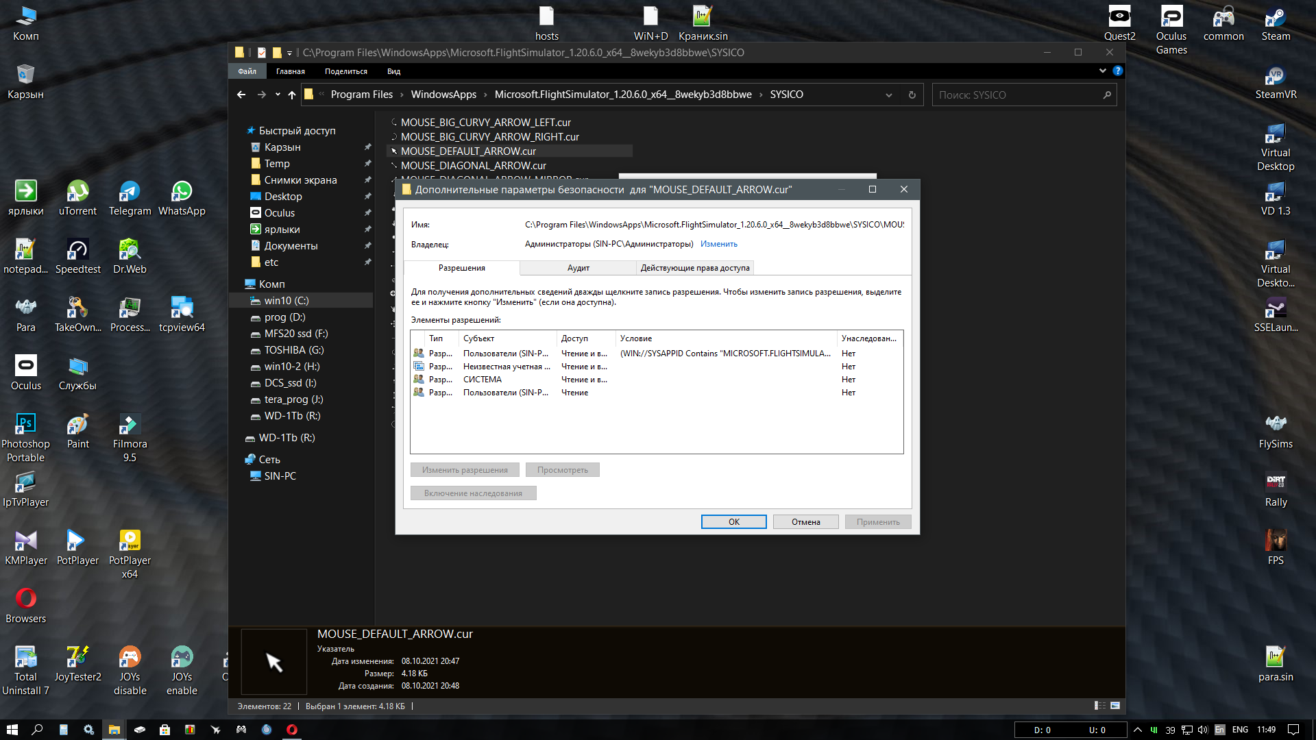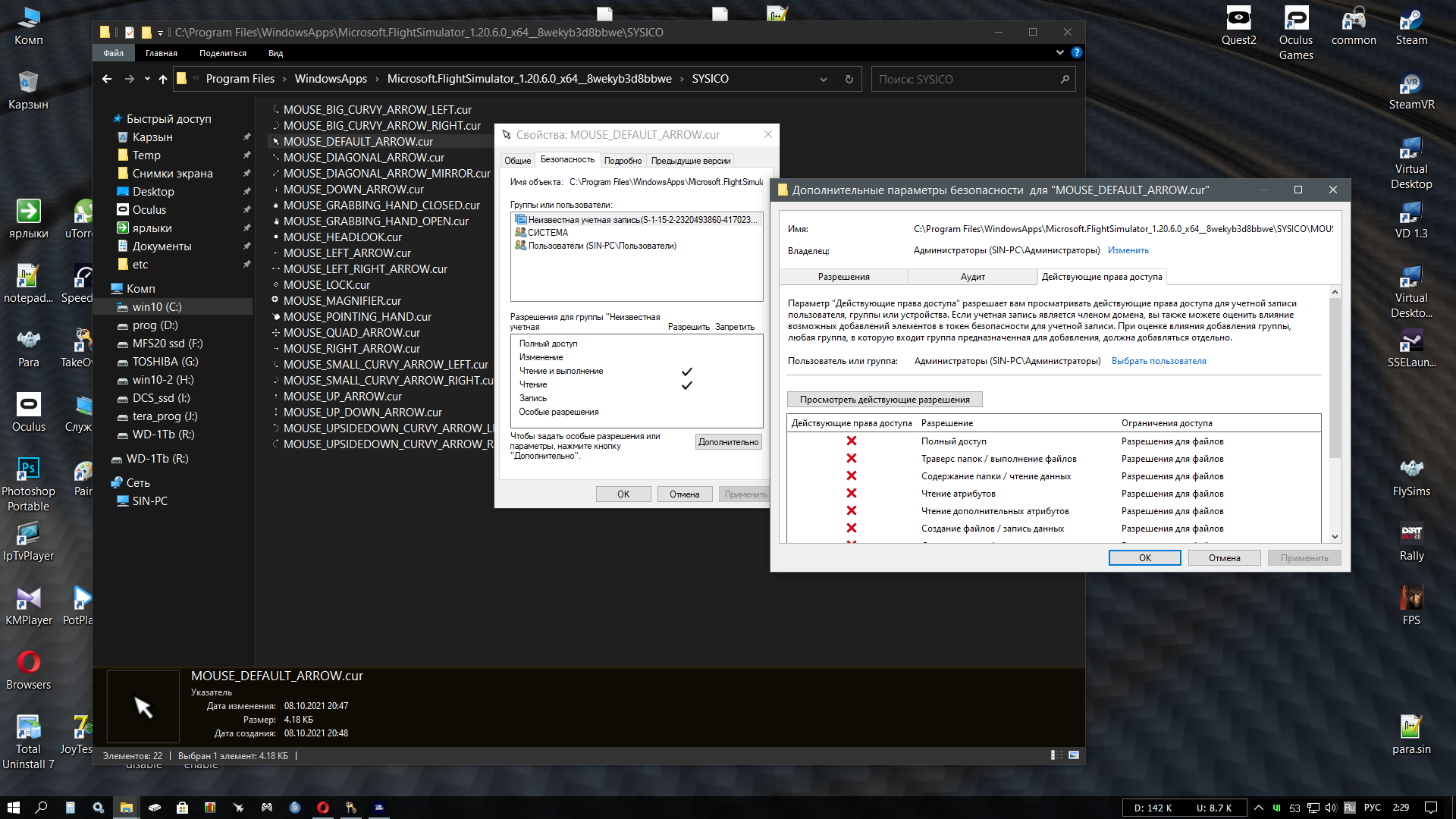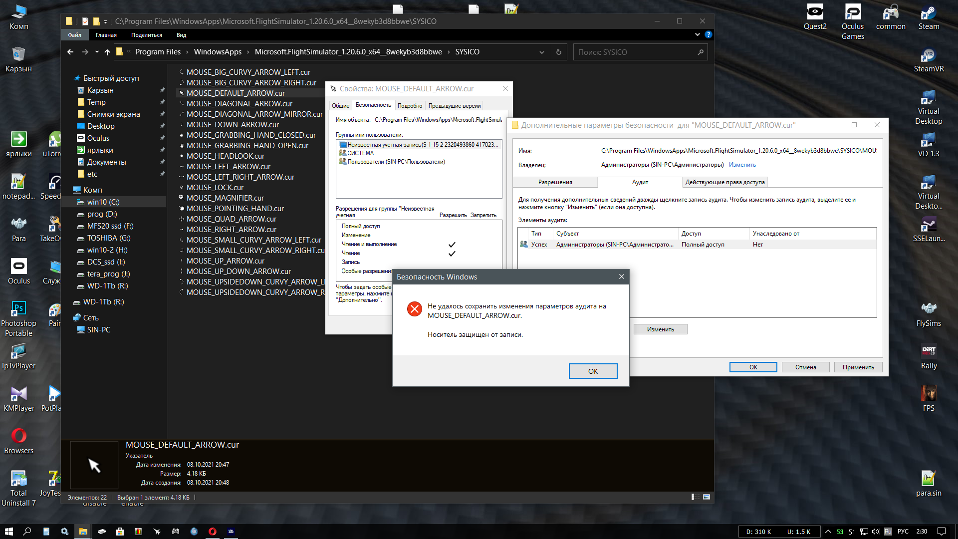 huligan Опубликовано: 30 октября 2021 Опубликовано: 30 октября 2021 как получить доступ к папке C:\Program Files\WindowsApps\Microsoft.FlightSimulator_1.20.6.0_x64__8wekyb3d8bbwe\SYSICO\ а точнее к файлу C:\Program Files\WindowsApps\Microsoft.FlightSimulator_1.20.6.0_x64__8wekyb3d8bbwe\SYSICO\MOUSE_DEFAULT_ARROW.cur собственником себя сделал,но именно с этой папкой ничего сделать не могу Хочу заменить файл своим Даже под учёткой "Администратор" ничего там не могу поменять :(((