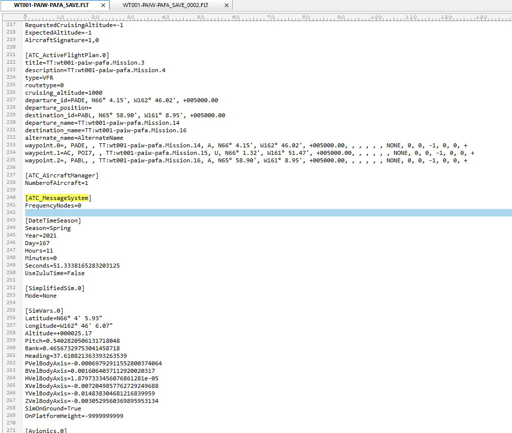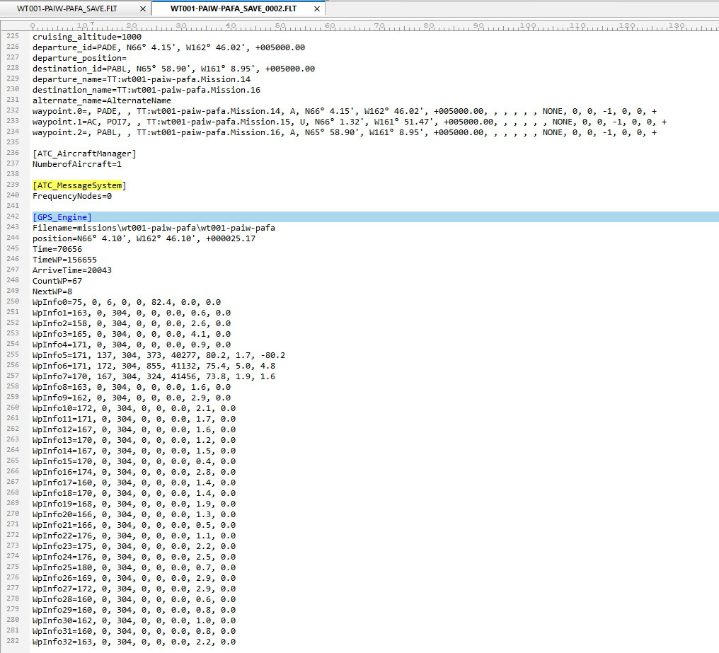 Rouslan Опубликовано: 22 ноября 2021 Опубликовано: 22 ноября 2021 Ну вот, прошло почти полгода, как майки сломали сохранение маршрутов в bushtrip. С этого момента сим для меня почти умер, т.к. это была очень интересная его часть, благодаря великолепным бесплатным маршрутам с описаниями достопримечательностей и т.п. Перед самым "удачным" обновлением я начал WorldTour с Аляски на DA-62 и на втором участке флайтплан пропал с VFR карты и из Garmin. Можно конечно использовать LNM, но этот перелет это даже не про ориентирование на местности, а больше про путешествие. Потому очень хотелось бы иметь в garmin время до следующей точки, её название и т.п. А флайтплана то нет. Читал в свое время на форуме, что проблема возникает из-за файлов сохранения прогресса. И вот таки разобрался где и как это исправить. Значит так, если после выполнения посадки после первого участка на окне завершения полета нажать Continue или Next (не помню как там точно) т.е. запустить следующий полёт (он стартанет почти сразу т.к. сим запущен, а самолёт на аэродроме вылета), и в потом выйти в основное меню, то флайтплан сохранится. Но не сохранится полетное время в Logbooke. Сохранится только время последнего участка. Так я уже потерял около 400ч. за два года. А если на окне завершения нажать Main Menu, то время сохранится, а флайтплан с POI уже нет. Озадачился сравнением файлов сохранений и косяк найден, а заодно один интересный параметр, повышающий интерес и реализм. Итак, файлы сохранений bushtrip-ов находятся по пути: [Профиль пользователя]\AppData\Roaming\Microsoft Flight Simulator\MISSIONS\ACTIVITIES\WT001-PAIW-PAFA_SAVE\ В данном случае Bushtrip называется WT001-PAIW-PAFA (Первая часть WorldTour от PAIW до PAFA). Вот заодно информация о том где хранятся сохранения и как сбросить прогресс. У каждого Bushtripa есть основная папка сохранения и папка участка. Для данного WT001-PAIW-PAFA_SAVE - основная, WT001-PAIW-PAFA_SAVE_0001 - первый участок, WT001-PAIW-PAFA_SAVE_0002 - второй участок. Ну соответственно для каждого участка дописывается _00XX. Проблема в некорректном сохранении данных в основной папке. При этом в папке участка данные сохраняются корректно. Данные сохранятся в FLT файл. Для основного сохранения это WT001-PAIW-PAFA_SAVE.FLT для второго участка WT001-PAIW-PAFA_SAVE_0002.FLT Открываем FLT файл последнего участка и находим в нем секцию [GPS_Engine]. Это то, что не сохраняется в основной файл. Эта секция идёт за секцией [ATC_MessageSystem]. Необходимо скопировать всю [GPS_Engine] из последнего участка в основной файл. И проблема отсутствия флайтплана и POI и маршрута на карте на следующий участок решена. Маршрут сохраняется на весь буштрип, а не только на следующий перелет. Но ошибка сохранения всё равно запорет файл после завершения перелета и выхода в меню. Но теперь то мы знаем как это опять исправить. И так каждый раз. А теперь из интересного- в свое время я как то говорил, что очень жаль, что при выходе из буштрипа в меню, ты не продолжаешь потом следующий участок с времени завершения, а начинаешь его с времени прописанном как начало буштрипа. Т.е. длительные перелеты с 100500 посадками, начинающиеся на рассвете и заканчивающиеся на закате можно реально закончить на закате только проходя их непрерывно. Вышел в меню - начал середину перелета опять на рассвете. Меню время/погода как правило не доступны в буштрипах без developer mode. Так вот как я понимаю, с временами это тоже баг, причем почти двухгодиной давности. Секция [DateTimeSeason] последнего участка хранит дату и время пос