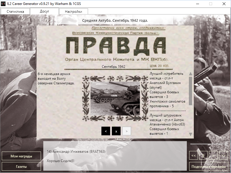 Warhamm Опубликовано: 22 февраля 2016 Автор Опубликовано: 22 февраля 2016 Вчера, когда у меня случилась эта неприятность, отложил все логи в сторонку. Вот по времени вроде последние http://rghost.ru/7HXlfzSSM Игра сгенерировала миссию на 31 сентября 42 года. Поэтому парсер падал. Добавил костыль больше падать не будет, но по идее разработчикам надо бы у себя поправить генерацию дат. В итоге он числится погибшим. die.png die-2.png Меня тоже отправили в госпиталь... исправлено. Больше такого не будет повторятся. Я тут у БРАТа смотрел.. У него вообще интересные вещи... такие как: Текущий статус - увольнение 25.09.1942 Это что такое? и вот это тоже не понятное: Базирование - Средняя Ахтуба, Сталинград 894-й истребительный авиационный полк ПВО переведен на другой фронт. Увольнение по причине здоровья, пилот не пригоден к полетам. Строчку с базированием убрал если карьера закончена. Придется архив перекачать. 2