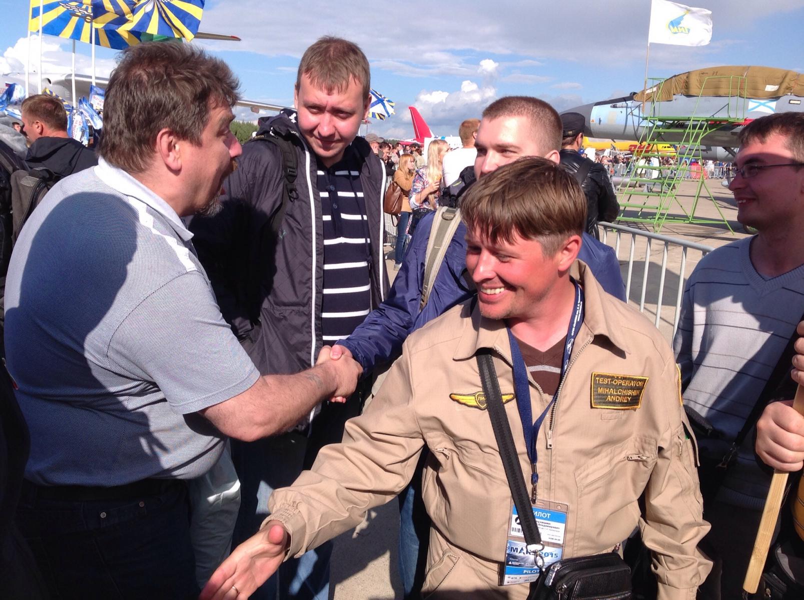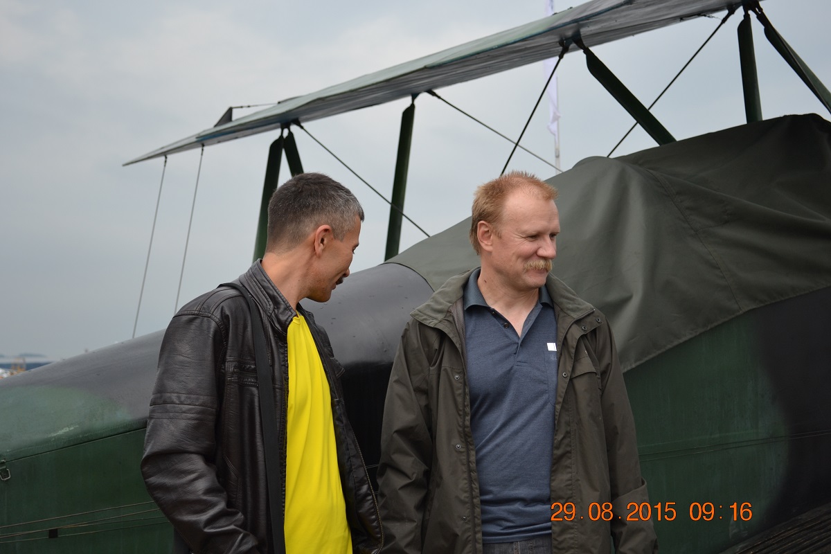=MG=Dooplet11 Опубликовано: 30 августа 2015 Автор Опубликовано: 30 августа 2015 (изменено) Как обещал, еще фотки с МАКСа и коментарии. Собрались в 8-00 утра на Казанском в составе Кирилла, Кванта, Дуплета , Ламара , Ивана и еще двоих "сочувствующих товарищей" и двинули на МАКС. Добрались без особых приключений, достаточно комфортно, коротая время за разговором о симуляторах, авиации, лошадях и женщинах. По прибытии на выставку Андрей Квант ( сам участник выставки в составе экспозиции СибНИИА) пригласил к себе на площадку. Начали осмотр с летающей лаборатории Як-42, членом экипажа которой является Квант. Ребята из экипажа провели внутрь самолета, где прочитали лекцию, как мониторится атмосфера и делается погода: Мы с удовольствием присели в ВИП-кресла этого храма науки: Среди оборудования обнаружился вот такой прибор: Видимо, чтобы гладить стюардессу. Или разглаживать смятую пачку беломора, если штурман забыл ЖПС. Но на борту есть приборы и посложнее. Лазерная пушка: Кирилл большой любитель больших самолетов. В кресле КВС: На площадке находилось еще одно очень интересное детище СибНИИА, реинкарнация Ан-2: Кто скажет, для чего в нем у правой ноги пилота закреплен топор ? Реклама 777?: У ветеранов , летавших на Ан-2, новая машина вызывала живейший интерес: Квант рассказал о конструкции нового крыла, его механизации, о новых возможностях самолета: Осмотрев экспозицию СибНИИА, отправились прогуляться по МАКСу, гордо неся табличку с логотипом Ил2БЗС: К этому времени начались полеты: Подошел один товарищ , клюнув на нашу табличку: -На ИЛ-2 катаете? - "Катаем", на компьютере! : Америка России подарила самолет: И тут грянул дождь. Народ ломанул по павильонам. Мы тоже. Совершенно случайно оказавлись рядом со стендом СибНИИА: Андрей Квант оказался очень гостеприимным и радушным человеком. И девчонки со стенда тоже. Нас ,слегка промокших и понурых, завели к себе и угостили кофе и бутербродами: Пока пили кофе, дождь перестал, полеты возобновились, и мы пошли на летное поле, тем более, подходило время встречи с АхАшниками. К нашему плакату народ постепенно прибывалЖ Ну а потом мы все пошли к площадке с летающей историей. Андрей Квант и там оказался свом человеком, и многие из нас в результате прикоснулись к этой истории руками: В общем, день удался, не смотря на неустоичивую погоду. Познакомились лично, пообщались. Все было просто супер! Изменено 30 августа 2015 пользователем =MG=Dooplet11 20