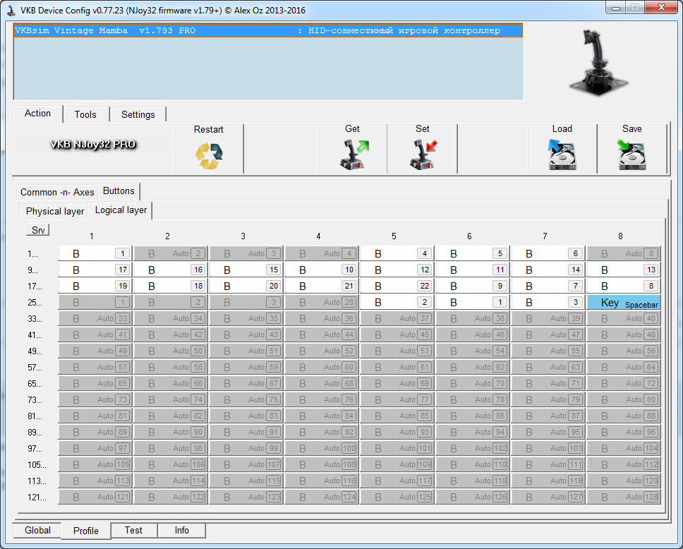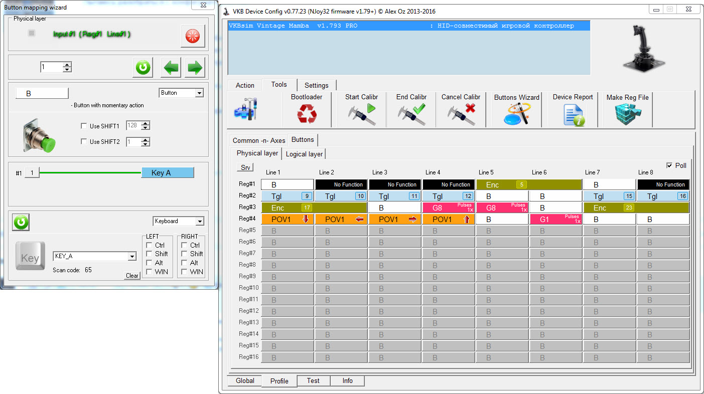 Vumpel18 Опубликовано: 1 июня 2016 Опубликовано: 1 июня 2016 (изменено) Пытаюсь разобраться с конфигуратором vkb. Fat mamba + ручка warthog. В том состоянии, что он пришёл, работают только оси и кнопки+крутилки на основании. Ну или это я уже что-то накрутил... Тот-же vkb button tester не показывает нажатие ни одной кнопки на ручке warthog. Пытался замапить курок на клавиатуру(space), не выходит, т.е. понимания нет, что и куда.... Ну в и финале, что бы хоть от чего -то оттолкнуться, пытаюсь загрузить профили под warthog, которые тут были 2-3 страницы назад, и получаю "Non compatible profile" v.00.77.23, прошивка 1.793 pro. Из под админа запускал, zconfig.ini удалял... Для начала посмотрите с стр. 108 этого документа: https://yadi.sk/i/807VhYwOmn5hJ. Работа кнопок ручки будет только после следующего: - общих настройках контроллера задать следующие параметры: ▼ количество регистров #Reg 6, ▼ количество хаток #Hat 1, ▼ количество кнопок #But 38, я рекомендую 128. Не забываем записывать параменры в память контроллера - жмакать кнопку Set/ Загружаемый Вами профиль может работать не корректно. Лекарство: настройки кнопок, хаток вбивать в ручную согласно руководства см. стр. 108. Прошивка и конфигуратор самые крайние - новее пока нет. Изменено 1 июня 2016 пользователем =Mr.G.B.=Vumpel18 1