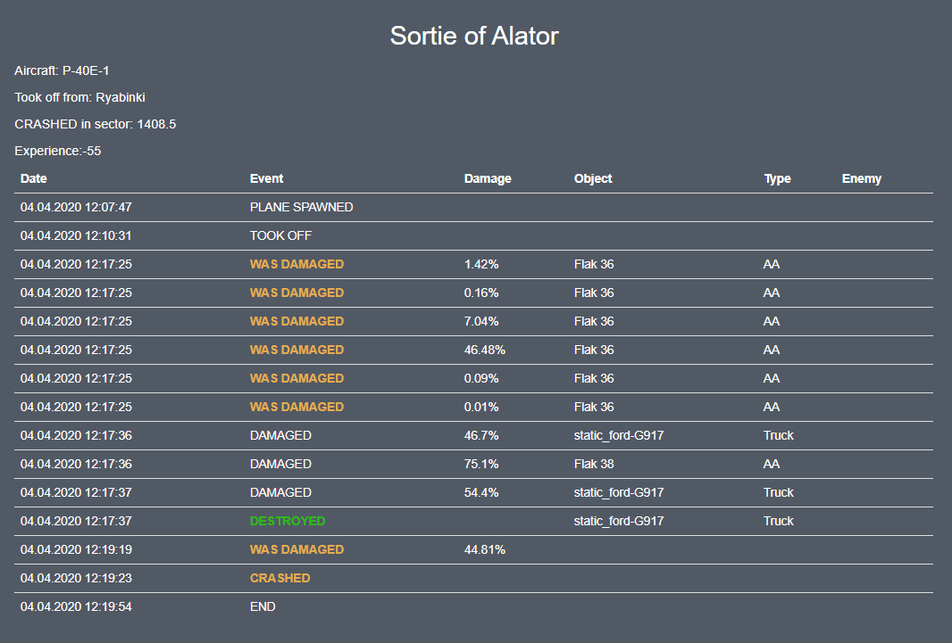 WG_Magners Опубликовано: 5 апреля 2020 Опубликовано: 5 апреля 2020 (изменено) 3 минуты назад, Alator сказал: не... оба раза в чисто поле садился, оба раза с отказавшими движками. Если "разбился", значит либо на вражеской территории, либо всё таки самолет был слишком сильно поврежден. Суммарно повреждений на 100% или около того: Скрытый текст Изменено 5 апреля 2020 пользователем WG_Magners