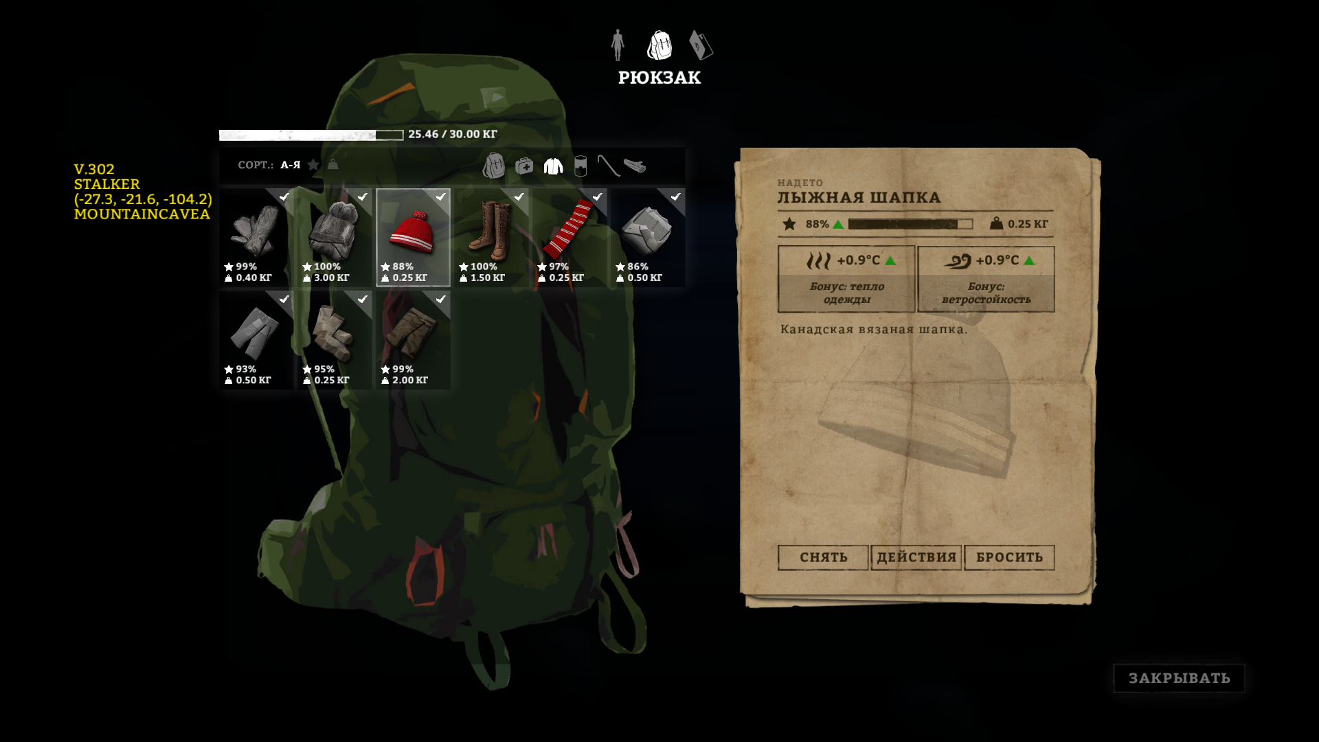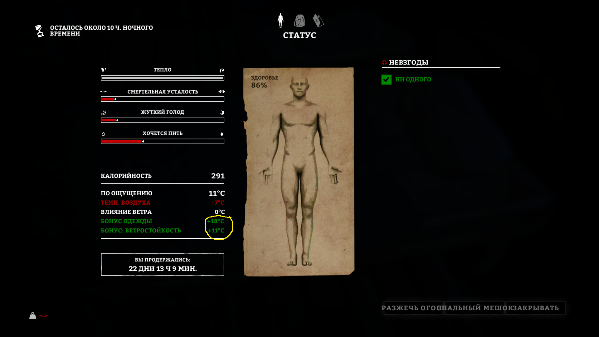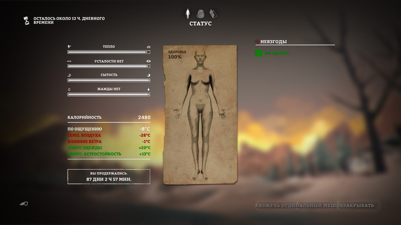 marc Опубликовано: 7 апреля 2016 Автор Опубликовано: 7 апреля 2016 Может у тебя версия игры другая? У меня 3.02, там и температур то таких не бывает максимум что видел с утра -45 градусов, но это кратковременно час от силы, и всего один раз, обычно утром -25 - 30 не ниже, с таким прикидом как у тебя при всем желании замерзнуть не получится)) А так вот мои одежки, максимум дают +24 градуса лучще пока не находил screen_(-27, -22, -104)_5fa7699c-8b0f-47d3-ae2f-b3af4e4918b0.png Из твоего списка не видел только канадскую шапку, может она какая то эксклюзивная? Вот здесь я смотрю. Температура + ветрозащита в сумме.