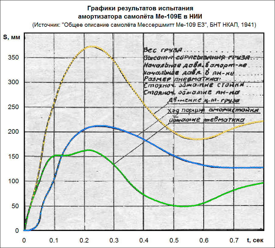 AnPetrovich Опубликовано: 31 августа 2016 Опубликовано: 31 августа 2016 "Несуществующий" клапан и золотниковое кольцо вопрос терминологии. Кольцо выполняет функцию переиускного клапана. И, как и клапану, ему присущи время срабатывания и наличие переходных режимов. Да, золотниковое кольцо иногда называют кольцевым клапаном, верно, и это действительно вопрос терминологии. Но касаемо времени срабатывания и переходных режимов - давай ещё раз внимательно прочитаем то, что я написал: Есть золотниковое кольцо, которое перекрывает проход масла через отверстия при обратном ходе. То есть оно лишь может «отсрочить» повышение гидросопротивления при переходе от прямого хода к обратному, но никак не может вызвать задержку перепуска масла, как обсуждаемый в этой теме несуществующий клапан. «Отсрочка» - это и есть время срабатывания. Которое, разумеется, обуславливает переходный процесс. Однако золотниковое кольцо не может запереть (как тут обсуждается) перепуск масла. Там простейшая конструкция амортизатора с постоянными отверстиями для протока гидрожидкости и с дополнительным торможением на обратном ходе поршня - за счёт частичного перекрытия этих отверстий золотниковым кольцом (ну пусть будет «кольцевым клапаном», ок). То есть проходное сечение есть всегда (маленькое или большое), и гидрожидкость никогда не бывает заперта, чтобы хоть на мгновенье блокировать ход штока. Чертежи амортизатора фирмы «Электрон», установленного на Ме-109, описание его устройства и принципа работы можно найти в «Кратком техническом описании амортизаторов шасси и костылей, установленных на самолётах: Юнкерс Ju-88, Хейнкель He-100, Мессершмитт Ме-109, Мессершмитт Ме-110», БНТ, 1940г. и в «Амортизаторы основных стоек шасси самолётов», БНТ, 1948г. Теперь об участке 0 - 0,15 с. Хочу обратить ваше внимание на "наколотые" точки 10, 11,12 на графике обжатия амортизатора стойки. Точнее, т. 11. Вы не совсем точно ее накололи. Точки были «обколоты» а потом скорректированы, как я уже писал выше, для выравнивания полученных кривых по первой и второй производной. Это нужно делать, чтобы убрать «шум», так как при ручном «обкалывании» графиков чем больше точек (меньше интервалы между точками) тем больше на «обколотой» кривой локальных неровностей, еле заметных, даже если каждая точка максимально точно попадает прям вот в центр обкалываемой линии. Из-за этих неровностей такие обколотые зигзагообразные кривые очень «шумят» при операции дифференцирования. И если их не сгладить, то расчётные кривые скоростей, ускорений и сил представляют из себя вот такую вот картину вместо гладких графиков: Ведь не очень информативно, верно? Во-вторых, для определения ц.м. всей системы в каждый момент времени (если посмотреть на формулу из моего предыдущего поста) используется только h_гр и h_к, то есть графики движения груза и обжатия пневматика, обколотые с графика НИИ. График обжатия штока амортстойки здесь никак не задействован. Но не вопрос, мы можем взять h_гр не с графика НИИ, а как сумму обжатия пневматика и штока амортстойки, и при этом руками «вернуть» точки 10, 11, 12 на место, и даже 13 раз уж на то пошло получится вот такой «обколотый» график и вот такой график силы реакции опоры: Что-то принципиально изменилось? Блох ищем. На исходном графике имеем вертикальный участок на графике обжатия стойки и горизонтальный на графике 