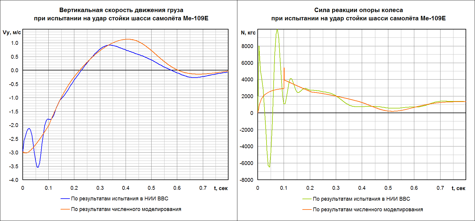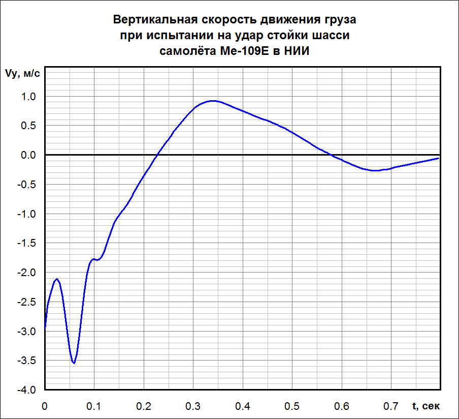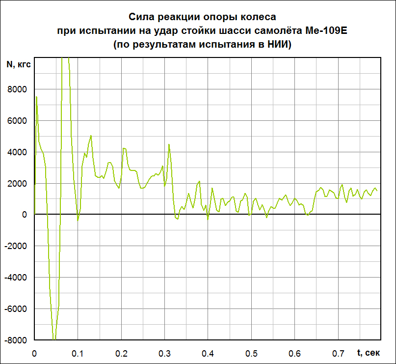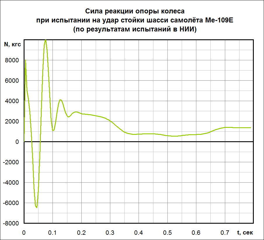 ROSS_BW_Kuznechik Опубликовано: 31 августа 2016 Опубликовано: 31 августа 2016 (изменено) 4. Ну и в итоге, согласно 2-му закону Ньютона, a = F / m, где F = N – mg, m – масса всей системы, N – сила реакции опоры колеса. Если нигде в п.1 – 4 не накосячить с размерностями (перевести миллиметры в метры, силы в Ньютоны и пр.) то в итоге получим такой вот график: Я тут у Кубланова нашёл общее уравнение движения стойки шасси m*d^2*y/dt^2 =N - Fa - Fr -mg где m – масса подвижной части стойки шасси, g – ускорение силы тяжести, d2y/dt2 – вертикальное ускорение подвижной части стойки, N – сила реакции ВПП на пневматики стойки, Fа – упругая сила (газового амортизатора стойки), Fг – диссипативная сила (гидравлического амортизатора стойки и сил трения При этом считается, что изменение N определяется только обжатием пневматиков "е", а Fа – обжатием стойки "s". Fг принято считать зависящим и от обжатия стойки, и от скорости изменения ее обжатия "s Не может быть в этом причина расхождения? Изменено 31 августа 2016 пользователем =BW=Kuznechik 1