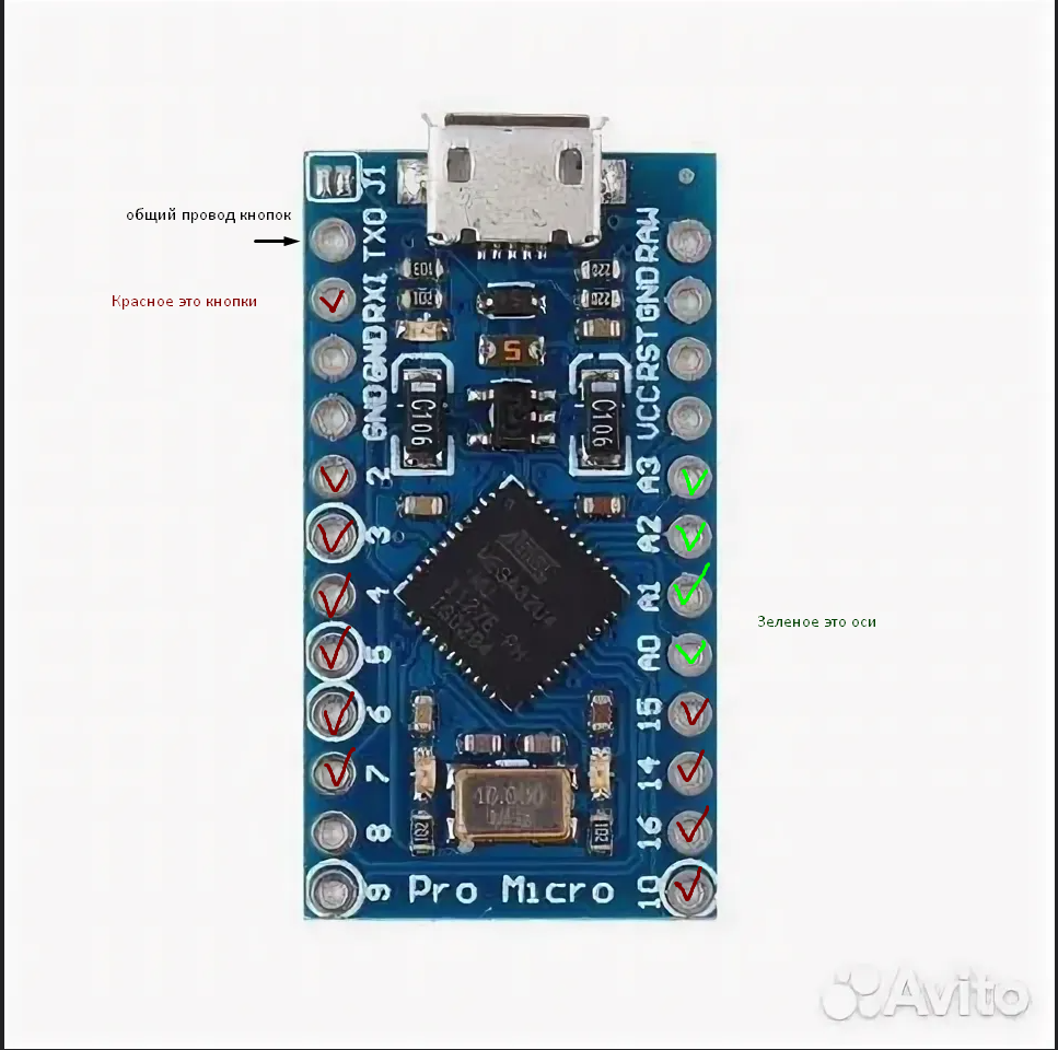 Andrey_Yulin Опубликовано: 30 сентября Опубликовано: 30 сентября (изменено) 1 час назад, sergeype сказал: Ничего не понял. На какой плате, какой общий вывод "Arduino Pro Micro"? Схема не имеет отношения к конфигуратору MMJOY; я так понимаю, что задача- просто включать мотор при нажатии на кнопку стрельбы? Нужно купить транзистор и резистор (если нет в хозяйстве), к пину RAW платы ProMicro подключить провод (+) на мотор, вывод резистора- к кнопке (или ко входу ProMicro, куда подключена кнопка), коллектор транзистора- к мотору. Работать будет независимо от конфигурации MMJOY. Да я хочу при стрельбе курком чтобы моторчик вибрировал у меня все кнопки на плате джойстка общим проводом соединены в одну колонку а ряды все отдельно. И да все кнопки без диода подключены так как все и так работает. Изменено 30 сентября пользователем Andrey_Yulin