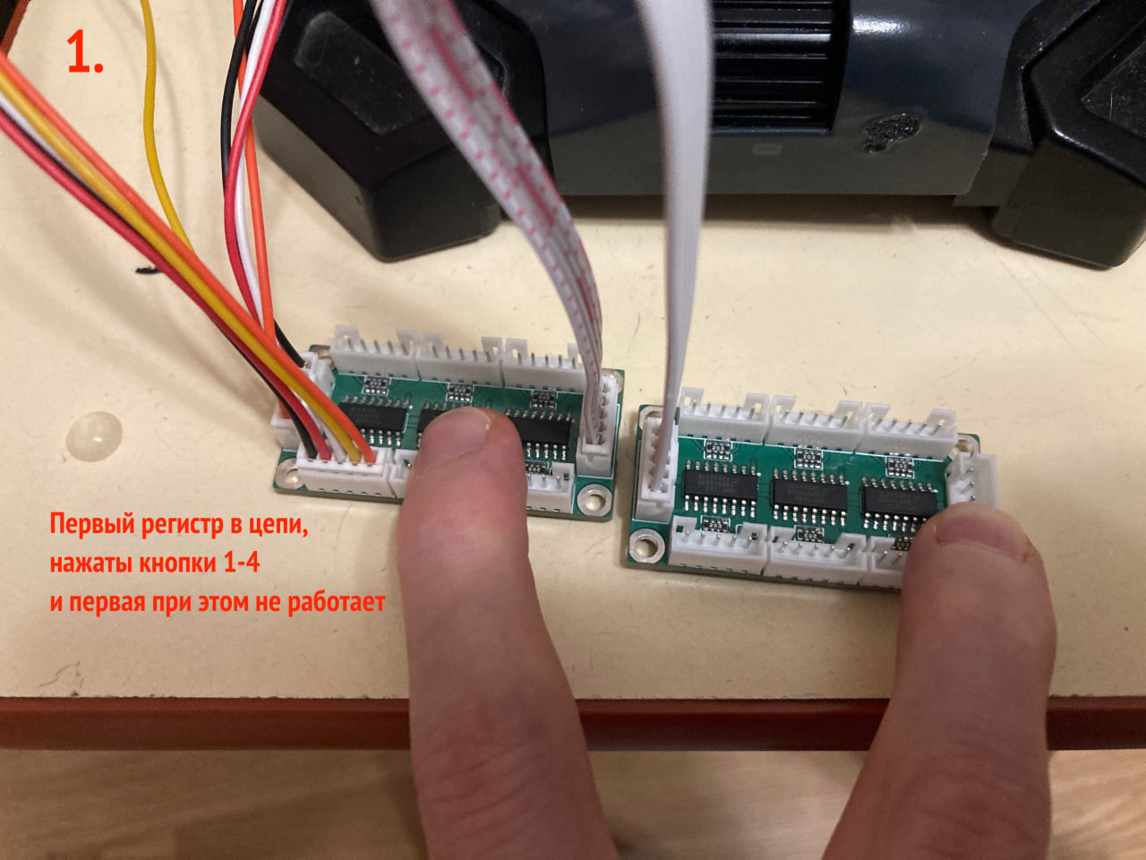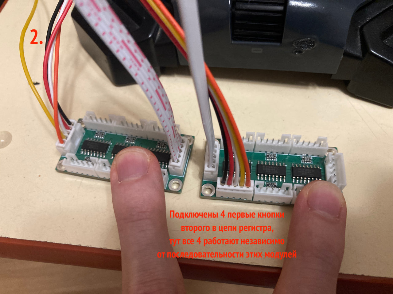 Nikolaychik Опубликовано: 20 часов назад Опубликовано: 20 часов назад Доброго времени суток! Я извиняюсь если подобная проблема уже обсуждалась, однако конкретно такой лично я не нашел. В общем приобрел я такие "модульные" сдвиговые регистры 74HC165D (по три чипа на плате = 24 кнопки), подключил к плате Leonardo с прошивкой MMJoy2 и казалось бы все заработало, но есть одно но! По какой то непонятной мне причине не срабатывает именно первая кнопка регистров, все же остальные 23 прекрасно работают. Я сначала думал что проблема в самой плате, может брак с контактом чипа, однако попробовал другую плату и проблема повторилась. Более того - если подключить два таких модуля в цепь (что бы получить в сумме 48 кнопок) то в таком случае все кнопки второго модуля (25-48) отлично работают и если поменять местами платы в цепи то также все кнопки второго модуля работают но именно на первом модуле (неважно какой из них первый) кнопка 1 работать напрочь отказывается. Буду очень благодарен в помощи разобраться в чем причина. Не то что бы я жадный на кнопки)) просто для моего проекта как раз нужны именно все 48.