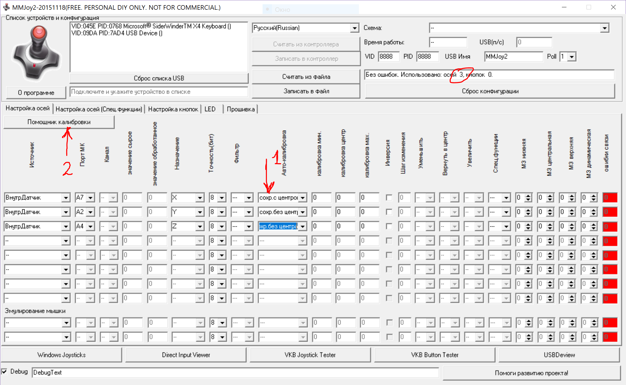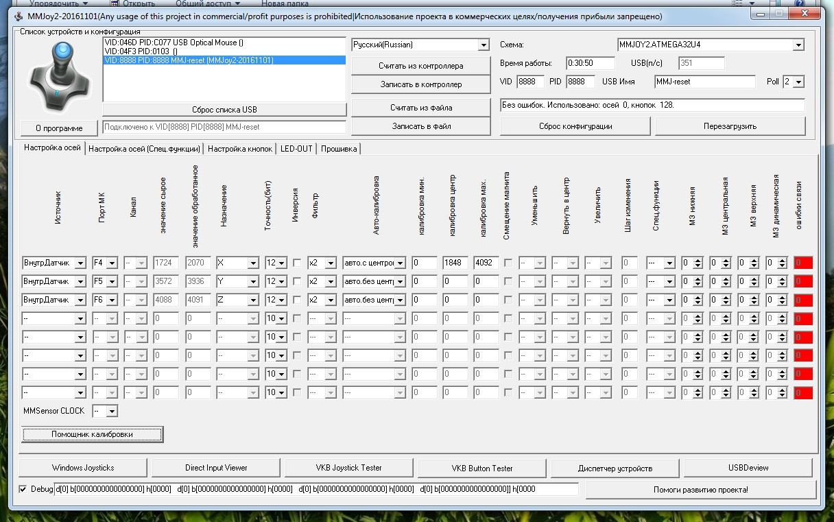 Krysnic Опубликовано: 5 августа 2018 Опубликовано: 5 августа 2018 15 часов назад, gran сказал: Переделал педали от logitech g940 на mmjoy. Win7 их не видит, хотя в игре отображаются как mmjoy reset. Подскажите все ли правильно выставлено. Как калибровать не понимаю. У вас 0 осей и 128 кнопок, раз это педали кнопок не должно быть. Сбросьте конфигурацию и назначьте оси опять. В калибровке выбирете сохранить с центром и без. Жмите помощник калибровки, ставите галочки на всех осях, далее сброс значений, двигаете максимально педали(оси). Отпустили педали стали в центр, жмете установить центр и сохраняете калибровку. Далее жмете записать в контроллер, контроллер перезагружается и смотрите что вышло. В окошке должно быть Без ошибок использовано осей 3 кнопок 0