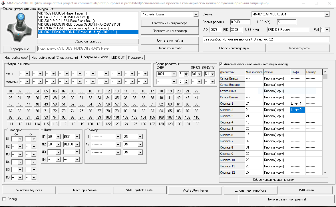 Vumpel18 Опубликовано: 21 марта 2019 Опубликовано: 21 марта 2019 Для Pro Micro нужен файл Firmware_lufa_[MMJOY2_ATMEGA32U4], который находится в папке Firmware соответствующей версии прошивки. Самое главное условие см. Скрытый текст Запрещено использовать русские буквы в путях к файлам прошивки и конфигуратора, не рекомендуется использовать папки и пути с пробелами в названиях. т.е. однозначно мертвый случай это сложить файлы проекта на "рабочий стол" или в "мои документы" на русской версии Windows.