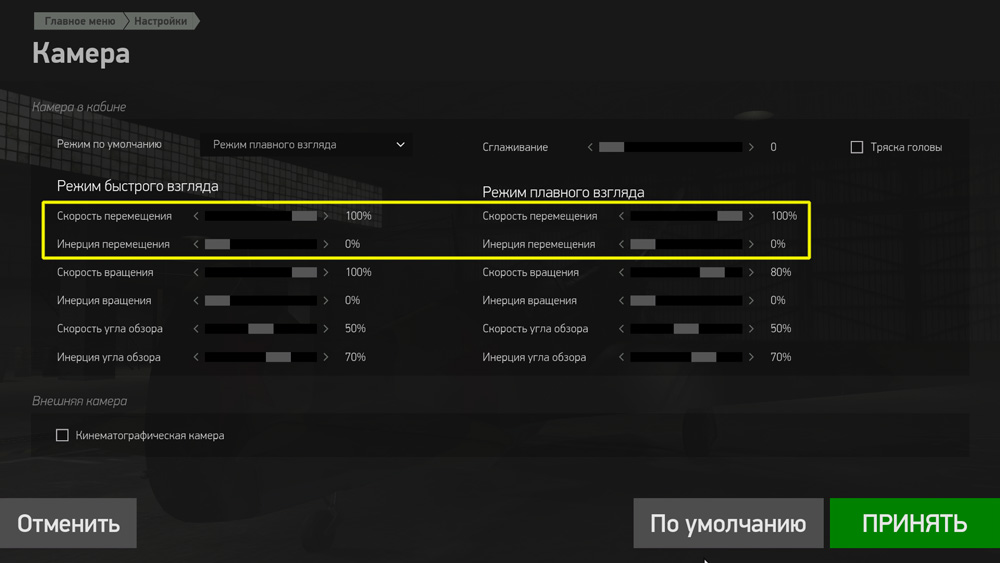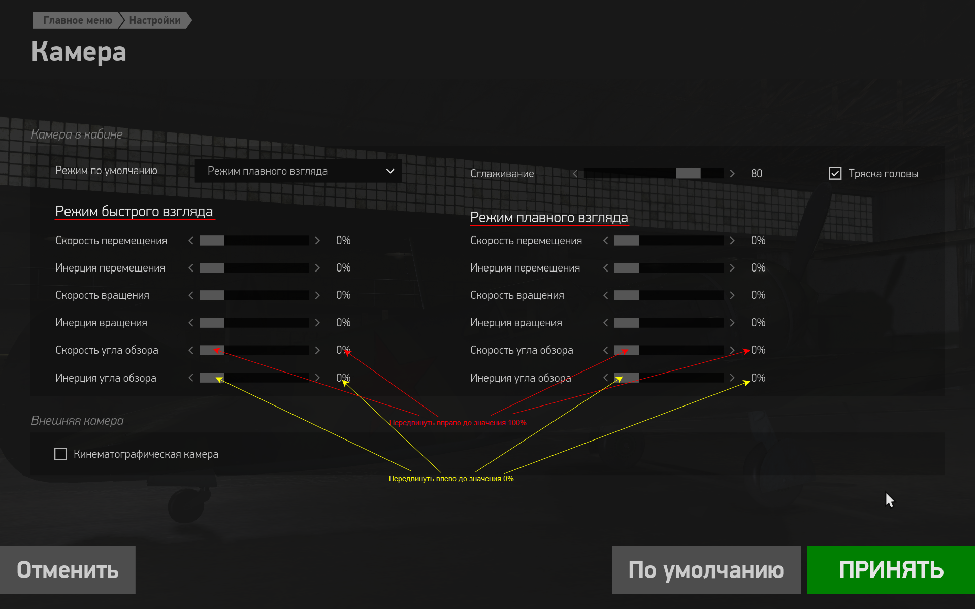 =SF=Thresher Опубликовано: 17 августа 2016 Опубликовано: 17 августа 2016 (изменено) мда народ... соображалка у вас ещё та... сэры... Имеется ввиду узкий FOV на одной из кнопок, широкий на другой... У Ил2БЗС реализовано только через "плавное" приближение удаление... Мда-с! У тебя похоже, вообще, в отличие от народа, соображалки совсем нет, раз ты не смог разобраться с камерой. Если у тебя на одной кнопке (клавише) назначено "Приближение взглядом", а на другой - "Удаление взглядом" и при этом в Главное меню - Настройки - Камера в столбце настроек "Режим быстрого взгляда" и в столбце "Режим плавного взгляда", параметр "Скорость угла обзора" выставлена в 100%, а "Инерция угла обзора" выставлена в 0%, то, если мне не изменяет память, ты даже не будешь успевать отслеживать насколько быстро узкий ФОВ будет меняться на широкий при нажатии назначенных кнопок. Разумеется, что значение параметра "Режим по умолчанию" на этой вкладке настроек значения не имеет. Изменение ФОВ происходит с одинаковой скоростью в любом режиме, если указанные выше настройки сделаны, как предлагается. Вот тут эти настройки: Простите сэр, но это не "мда народ...", а вы тупите... вам уже давно сказали, что и как а вы всё ещё никак не сообразите... Желтым выделено как должно быть настроено, для моментального перемещения, а дальше подгоняйте под себя. Ему нужно изменение ФОВ, а не перемещение головы в кабине параллельно приборной доски и не вращение головой. Изменено 17 августа 2016 пользователем Thresher