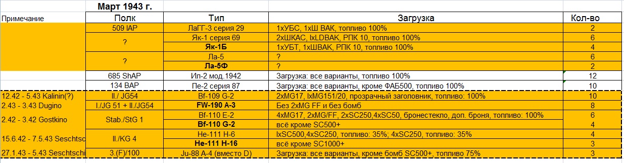Lofte Опубликовано: 27 марта 2017 Опубликовано: 27 марта 2017 Пока вынужденно не летаю, но не могу остаться в стороне) Мои предложения на следующий этап 1) Карту сделать зимнюю (просто для разнообразия) 2) Стоимость истребителей уровнять по ресурсам (либо уменьшить коэффициент с 1,5 до, например. 1,2) 3) Взять за основу операцию "Буйвол", она же Ржевско-Вяземская стратегическая наступательная операция. Это март 1943 г. Это даёт возможность существенно разнообразить состав самолётов Покопавшись в интернете и на сайте Холма, могу предложить сл. составы самолётов: Старый состав для сравнения 4