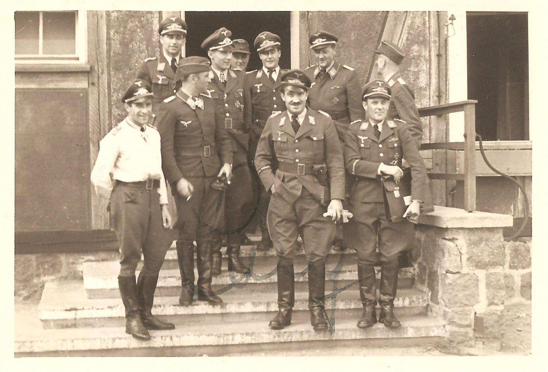 707shap_Srbin Опубликовано: 21 ноября 2016 Автор Опубликовано: 21 ноября 2016 Фото, подписанное Эмилем "Булли" Лангом. 1-й ряд, слева направо: Вольфганг Фальк (RK), Иоханнес Траутлофт (????, RK-EL??), Адольф Галланд (повязка Geschwader Schlageter RK-Br), кто-то очень знакомый, не могу вспомнить (тоже из JG26, та-же повязка). 2-й ряд, слева направо: неизв. (похож на Альфреда Гриславски), неизв. (похож на Байссвенгера, или Эрвина Клаузена - RK-EL), неизвестный пухляш (на Приллера или на Шпёте похож), неизв. (Иоханнес Визе??). Человека в дверном проёме на заднем плане и старичка, стоящего в пол-оборота, не считаю.