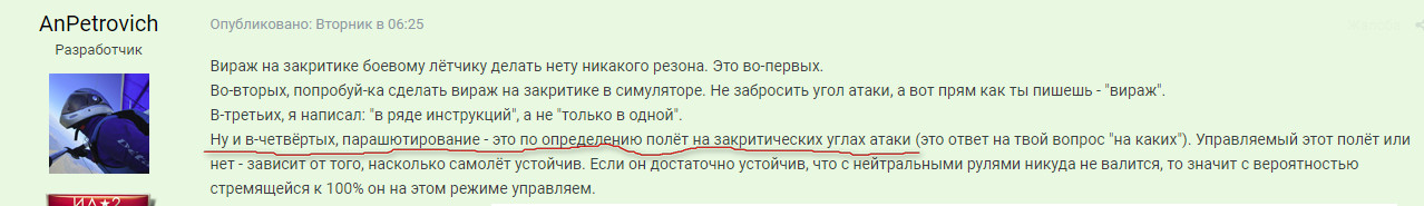 Gil--- Опубликовано: 7 мая 2018 Опубликовано: 7 мая 2018 16 минут назад, STOIKIY сказал: С чего весь сыр бор? Что пытается доказать кузнечик с этими критическими углами атаки? Это он сам пока толком не смог сформулировать. Но кажется суть в том, что при переходе критического УА с самолетом немедленно должно случаться СТРАШНОЕ! А в игре не случается, или недостаточно страшно, ничего более конкретного вытянуть пока не удалось.