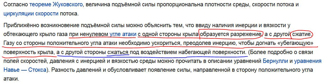 mpn2 Опубликовано: 6 марта 2019 Опубликовано: 6 марта 2019 (изменено) Для Вируса - лично! Здесь сразу идет путаница: Вначале озвучивается Нулевой УА а потом положительный! "Газу со стороны ПОЛОЖИТЕЛЬНОГО УА необходимо ускориться, преодолев инерцию, чтобы догнать "убегающую" поверхность крыла" на самом деле фраза должна звучать так: "Газу со стороны ОТРИЦАТЕЛЬНОГО УА необходимо ускориться, преодолев инерцию, чтобы догнать "убегающую" поверхность крыла" отрицательный УА у крыла - это отрицательный Физический угол верхней плоскости крыла, и крыло своей отрицательной плоскостью "убегает" от молекул воздуха, а те пытаются догнать крыло, но не могут из-за инерционности. Пока они начинают ускоряться и пытаться догнать крыло - оно опять от них улетает. Таким образом на крыле (над крылом) все время поддерживается разрежение (падение давления). А молекулы воздуха летят за крылом пытаясь его догнать, т.к. летят из зоны повышенного давления в зону разрежения. А с другой стороны (со стороны положительного физического УА - под крылом) происходит сжатие под воздействием набегающей поверхности. И под крылом образуется "подпор" - увеличение Давления. Вот что здесь написано. Правда через ЖОПУ! Включай голову! Давление - это степень сжатия /разрежение воздуха - это ММР между молекулами! Изменено 6 марта 2019 пользователем mpn2