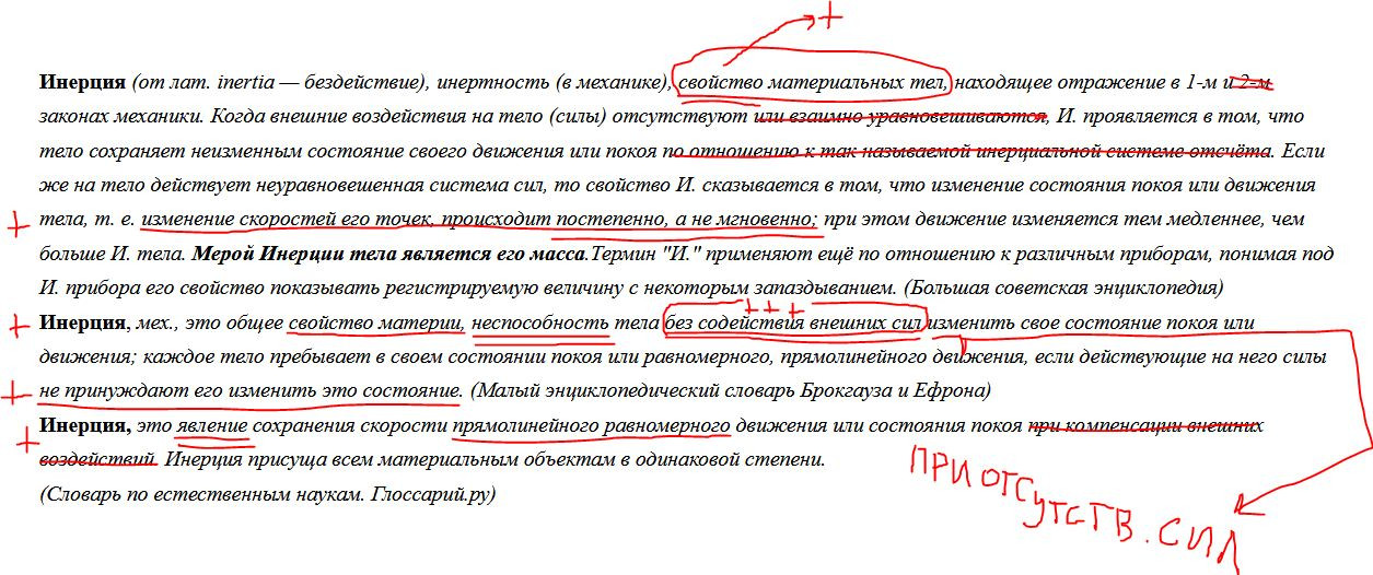 -DED-Mazai Опубликовано: 12 марта 2019 Опубликовано: 12 марта 2019 Инерция (от лат. inertia — бездействие), инертность (в механике), свойство материальных тел, находящее отражение в 1-м и 2-м законах механики. Когда внешние воздействия на тело (силы) отсутствуют или взаимно уравновешиваются, И. проявляется в том, что тело сохраняет неизменным состояние своего движения или покоя по отношению к так называемой инерциальной системе отсчёта. Если же на тело действует неуравновешенная система сил, то свойство И. сказывается в том, что изменение состояния покоя или движения тела, т. е. изменение скоростей его точек, происходит постепенно, а не мгновенно; при этом движение изменяется тем медленнее, чем больше И. тела. Мерой Инерции тела является его масса.Термин "И." применяют ещё по отношению к различным приборам, понимая под И. прибора его свойство показывать регистрируемую величину с некоторым запаздыванием. (Большая советская энциклопедия) Инерция, мех., это общее свойство материи, неспособность тела без содействия внешних сил изменить свое состояние покоя или движения; каждое тело пребывает в своем состоянии покоя или равномерного, прямолинейного движения, если действующие на него силы не принуждают его изменить это состояние. (Малый энциклопедический словарь Брокгауза и Ефрона) Инерция, это явление сохранения скорости прямолинейного равномерного движения или состояния покоя при компенсации внешних воздействий. Инерция присуща всем материальным объектам в одинаковой степени. (Cловарь по естественным наукам. Глоссарий.ру)