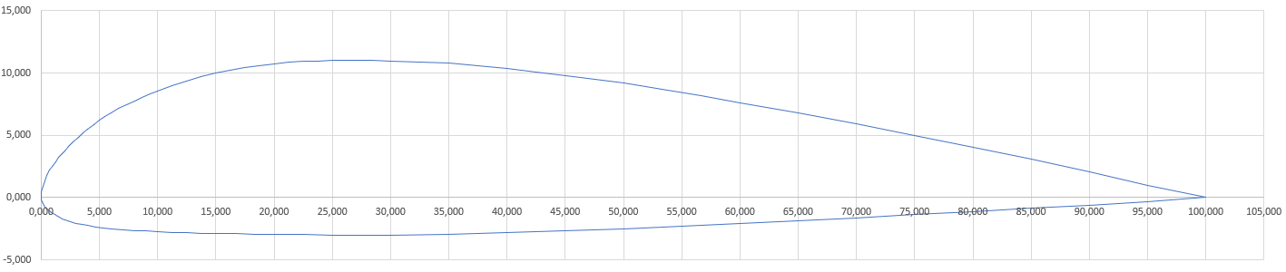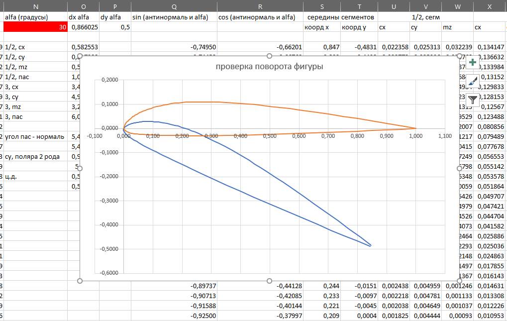 [I.B.]ViRUS Опубликовано: 12 марта 2019 Опубликовано: 12 марта 2019 Я решил посчитать по вашей теории крыло с профилем Р-II-14. Оно должно быть вам весьма знакомым, поскольку этот профиль используется на самолёте Ан-2. Что я сделал: построил в CAD-е сплайны через точки, на этих сплайнах добавил ещё точек в местах, где кривизна поверхности большая. Ссчитал координаты точек в CAD-е и вставил их в эксель, в итоге имеем следующий профиль (график - прямые линии между точками, неровности исчезают при увеличении масштаба): Я несколько упростил формулу для простоты расчёта и однозначной работы с углами. Вместо синуса к углу поверхности я считал через косинус к антинормали к поверхности, что по сути одно и то же, и исключает возможные ошибки: Скалярное произведение вектора -n на вектор V будет равным -n(вектор) * V(вектор) = v * 1 * cos(betta) = v * sin (alfa). Знаки, получающиеся на нулевом угле атаки с такими преобразованиями: Большой + лишь на участках, близких к носку. Всё чётко по вашей формуле с синусом "физического" угла alfa. Теперь к преобразованию формулы. Сначала преобразуем "классическую" формулу Ньютона, а потом вашу "правильную": F = p * s = Сумма((ro / 2) * v^2 * sin (alfa) * S) = C * (ro / 2) * v^2 * Sкр, где C - коэффициент полной аэродинамической силы. Легко заметить, что для определения коэффициентов Cx и Cy нужно поделить формулы на произведение напора на площадь. Поделим для начала на величину напора: сумма (sin (alfa) * s) = C * Sкр. Площадь Sкр = l * b. Поскольку у прямоугольного крыла нет сужения, все силы по вашей формуле действуют на параллельные участки по размаху крыла одинаково. Поделив на l, в сумме слева у нас будет величина произведения синуса альфа на длину профиля. Сократив ещё и на длину хорды b мы с вами получим, что аэродинамические коэффициенты равны сумме произведения элементарных площадок профиля (ньютоновская, "неправильная" формула): Сумма (sin(alfa) = Cпас Чтобы получить "правильную" формулу, мы результат выражения умножим на 6 для коэффициентов сопротивления, подъёмной силы и момента. Центр давления при этом останется на месте, поскольку и момент, и аэродинамическая сила будут умножаться на одно и то же число, а ЦД находится как отношение коэффициента момента к подъёмной силе поляры второго рода - результат будет в долях длины хорды. Теперь, для того, чтобы "повернуть" профиль, необходимо произвести преобразование систем координат: На картинке точка располагается в исходной системе координат, имея координаты x0 и y0. Преобразования координат находятся по рисунку: y = y0 * cos (alfa) - x0 * sin(alfa) x = y0 * sin (alfa) + x0 * cos(alfa) Вот в экселе график средних точек приведённого профиля (все длины поделены на 100, изначальная хорда равна 100) жёлтым относительно точек приведённого профиля, повёрнутый на 30 градусов по этой формуле: Далее, косинусы к антинормали находятся по формуле скалярного произведения векторов, синусы находятся по этой же формуле, но к векторам, проведённым через вершины профиля (я построил профиль от хвоста, двигаясь против часовой стрелки). Суммы квадратов синусов и косинусов соответствующих участков равны 1 (проверял). Перемножив коэффициенты подъёмной силы и силы сопротивления участка на координаты его центра находил величины момента относительно носка (коэффициенты момента относительно носка даны в Красильщиове). Коэффициент подъёмной силы и сопротивления пересчитывался в ПАС путём суммирования сил, д