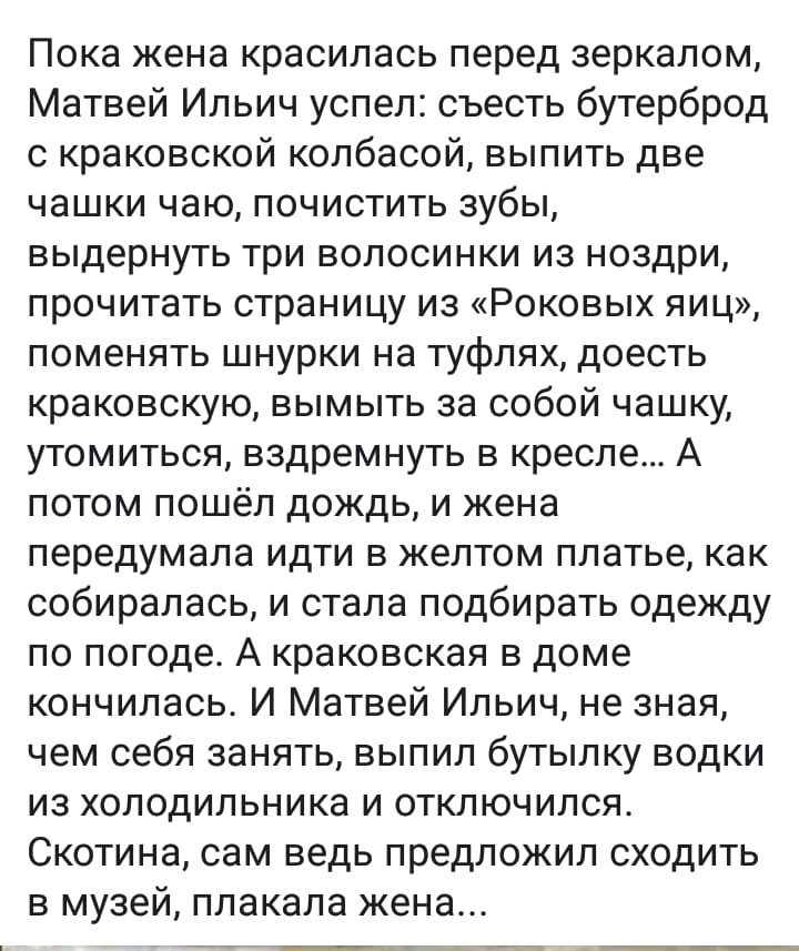 =FA=CATFISH Опубликовано: 7 сентября 2019 Опубликовано: 7 сентября 2019 (изменено) Есть женщины в русских селеньях С спокойною важностью лиц, С красивою силой в движеньях, С походкой, со взглядом цариц, — Их разве слепой не заметит, А зрячий о них говорит: «Пройдёт — словно солнце осветит! Посмотрит — рублём подарит!» (...) Красавица, миру на диво, Румяна, стройна, высока, Во всякой одежде красива, Ко всякой работе ловка. Любое обжорство выносит, Всегда терпелива, ровна... Я видывал, как она косит: Что взмах — то куча дерьма! (...) В игре её конный не словит, В беде не сробеет — соврет: Любовь на скаку остановит, И стулом по кату въеб..т Изменено 7 сентября 2019 пользователем =FA=CATFISH