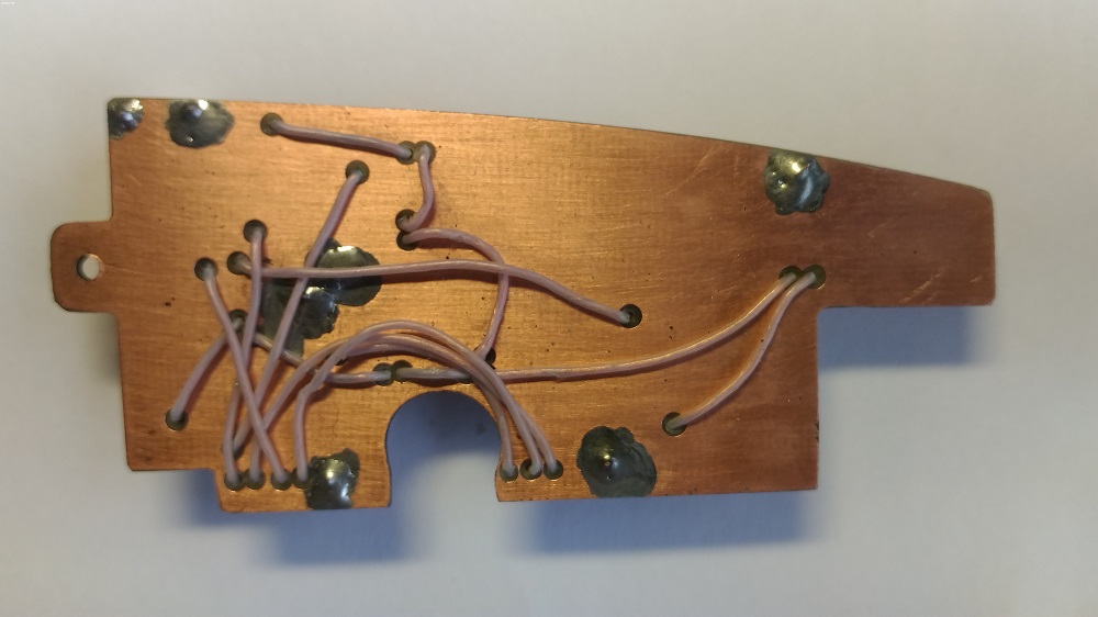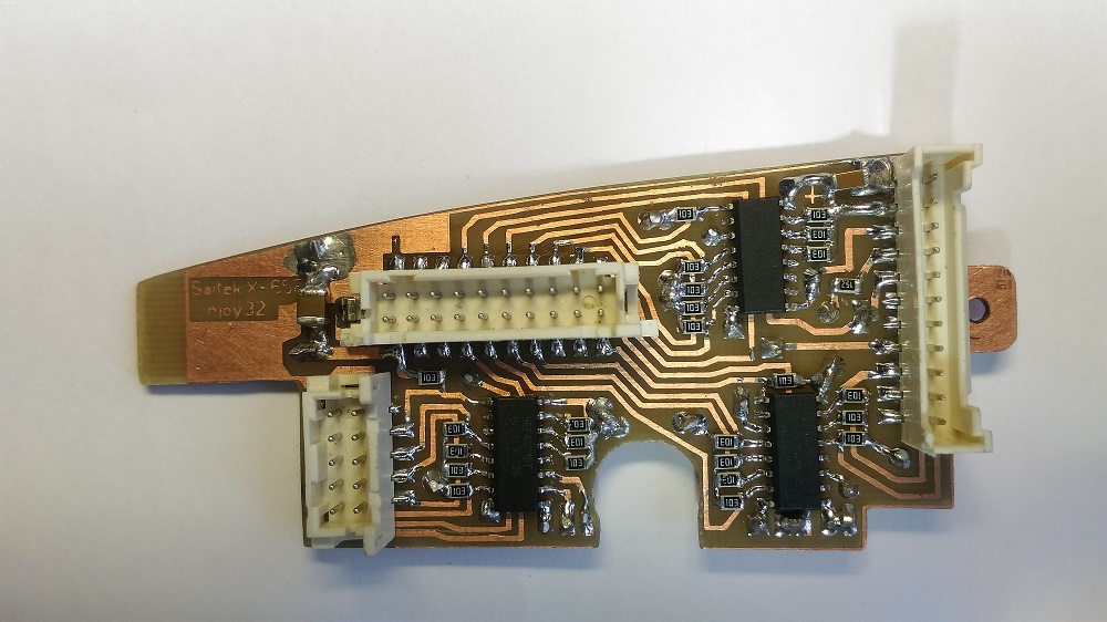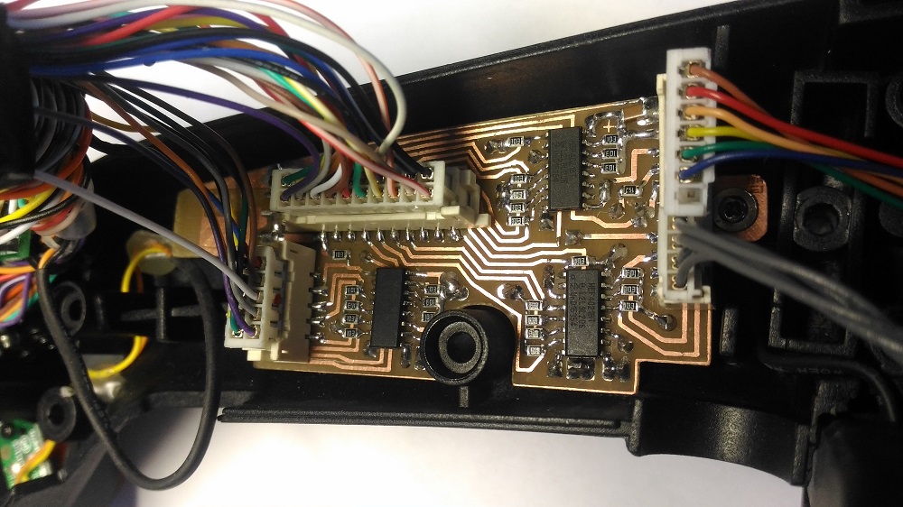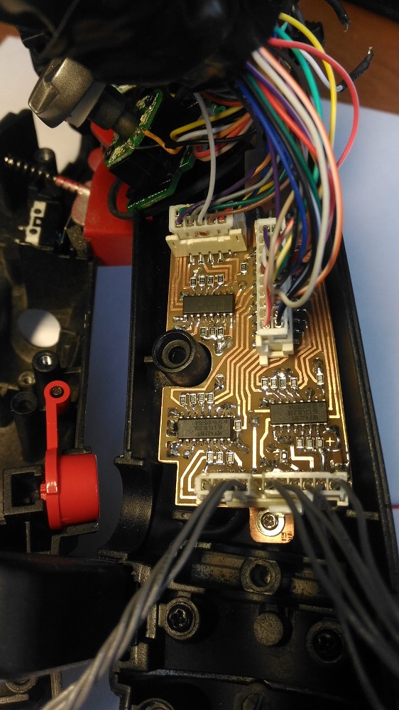 sovsov Опубликовано: 6 июня 2017 Опубликовано: 6 июня 2017 Доброго дня, вирпилы. Вот, пересадил ручку РУСа Saitek X56F на подстульник с контроллером njoy 32 PRO. Задачу поставил перед собой такую: сделать пересадку с минимальным вмешательством в сам РУС оригинала, чтобы потом можно было его назад на родное место вернуть, например, для продажи целым устройством. Ручка добротная, сделана методом точного литья из алюминия. В ней нет никакой электроники, поэтому из неё в базу тянется около 30 проводов, что приемлемо для неподвижной палки, но, не есть хорошо для подвижной. В самой ручке находится 21 кнопка . Решил сделать плату-переходник с тремя микросхемами регистров 4021 на борту, что даёт итого 8*3=24 кнопки. Резерв из трёх кнопок пока не задействовал, может потом по мере эксплуатации возникнут идеи, где и как их реализовать. Место под них в принципе можно найти, ручка довольно "пузатая". По эргономике , для меня лично не очень хорошая, но, что имеем, то и маем… ». Курок очень малый ход имеет, все кнопки очень легко нажимаются, кроме выносного нижнего курка , высота кнопки под POVом очень большая, когда к нему тянешься, можно её задеть, верхняя правая хатка должна быть по той-же причине повыше нижней и т. д. Нижняя боковая хатка очень чувствительна к нажатиям. Для загрубления снял её и в отверстие для штока вставил маленькое сантехническое резиновое колечко, обрезав его под размер. Теперь при случайном касании не нажимается. Заменил пружину на основном курке на более мощную. Т.к. плата делалась в одном экземпляре, чисто «для себя», сильно заморачиваться не стал, сделал одностороннюю. Такую и повторить дома проще будет, если кто захочет побаловаться с пайкой SMD резисторов 0805 типоразмера и микрух с корпусами SO-16. Плата изготовлена на двухстороннем текстолите толщиной 1мм. Обратный слой используется как земля-экран. Все отверстия диаметром 0,5 мм, кроме тех, что на квадратных площадках, рассверливаются со стороны земляной поверхности меди на половину толщины текстолита сверлом примерно 3мм для исключения КЗ с землёй. Перемычки сделал из тонкого провода МГТФ в тефлоновой изоляции ( обозначены на схеме красным и жёлтым цветом разной толщины). Он не оплавляется, гарантированно предотвращая ненужный коротыш. Для снятия изоляции использовал стрипер. В отверстия на квадратных площадках просто запаиваются перемычки на обратную сторону платы - это земляные контакты. Соединять перемычками вместе все площадки с одинаковой формой. Все резисторы примерно 10 килоом, кроме одного в 1,5 килоом, он указан на плате. Да по питанию ещё одна блокировочная ёмкость примерно 0,1 мкф. После разборки джойстика вытянул провода вместе с разъёмом. Подключение к плате соответственно двум имеющимся в ручке шлейфам. Со жгута в ручке снял термоусадку, так кучу проводов легче распушить и расположить внутри, не обрезая их. По однорядному разъёму плата соединяется с ручкой шлейфом от Кобры 5, распайка соответствует с первого контакта. Обратите внимание!! На фото, где присутствует разъём от Кобры, его надо визуально повернуть на 180 градусов, сфоткано неправильно, теперь всё собрано, не стал переснимать!!!! Питание: синий и зелёный провода. И входной однорядный разъём потом укоротил, иначе за кнопку задевал, на схеме уже поправлено. Оставшиеся 3 контакта-это дополнительные кнопки, которых нет в ручке, но можно п
