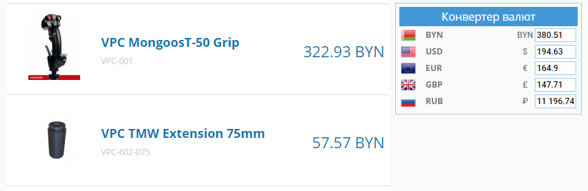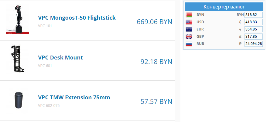 ver1ex Опубликовано: 28 октября 2017 Опубликовано: 28 октября 2017 1. VPC MongoosT-50 Grip - 9500 руб. + VPC TMW Extension 75mm в подарок 3. VPC TMW Extension 75mm - 1500 руб. 4. TMW Mounting Plate Base - 600 руб. Варианты комплектов: 5. VPC MongoosT-50 Flightstick (РУС+база) - 19000 руб.* 6. VPC MongoosT-50 Flightstick (РУС+база+VPC Desk Mount) - 21000 руб.* + VPC TMW Extension 75mm в подарок * пересыл в пределах 1000 руб. включён (с забором груза по адресу) 7. VPC MongoosT-50 Base (база) - 11500 руб.** ** пересыл в пределах 500 руб. включён (с забором груза по адресу) 8. VPC Desk Mount - рассмотрю предложения п. 8 в итоге есть или нет? Цена?