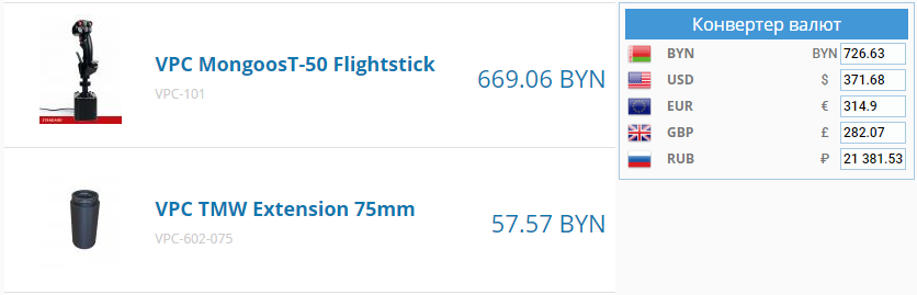 a___k___s Опубликовано: 18 октября 2017 Автор Опубликовано: 18 октября 2017 (изменено) Обновил: 1. VPC MongoosT-50 Grip - 9500 руб. + VPC TMW Extension 75mm в подарок 2. VPC Desk Mount - 2500 руб. + TMW Mounting Plate Base в подарок 3. VPC TMW Extension 75mm - 1500 руб. 4. TMW Mounting Plate Base - 600 руб. Комплекты: 5. VPC MongoosT-50 Flightstick (РУС+база) - 19000 руб. + VPC TMW Extension 75mm в подарок 6. VPC MongoosT-50 Flightstick (РУС+база+VPC Desk Mount) - 21000 руб. + VPC TMW Extension 75mm в подарок Изменено 18 октября 2017 пользователем a___k___s