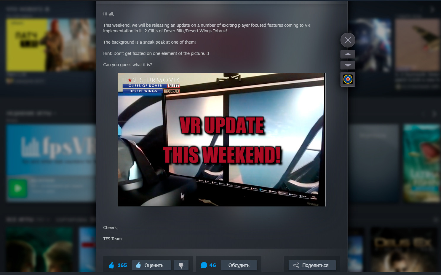FTC_Rostic Опубликовано: 21 августа 2021 Опубликовано: 21 августа 2021 7 часов назад, sinco сказал: VR не прикрутили ещё? Нет, не прикрутили. Но уже активно разрабатывается. В данный момент переделывают кокпиты чтоб полностью 3D были (сейчас частично некоторые элементы это просто 2D текстурки). 1 3