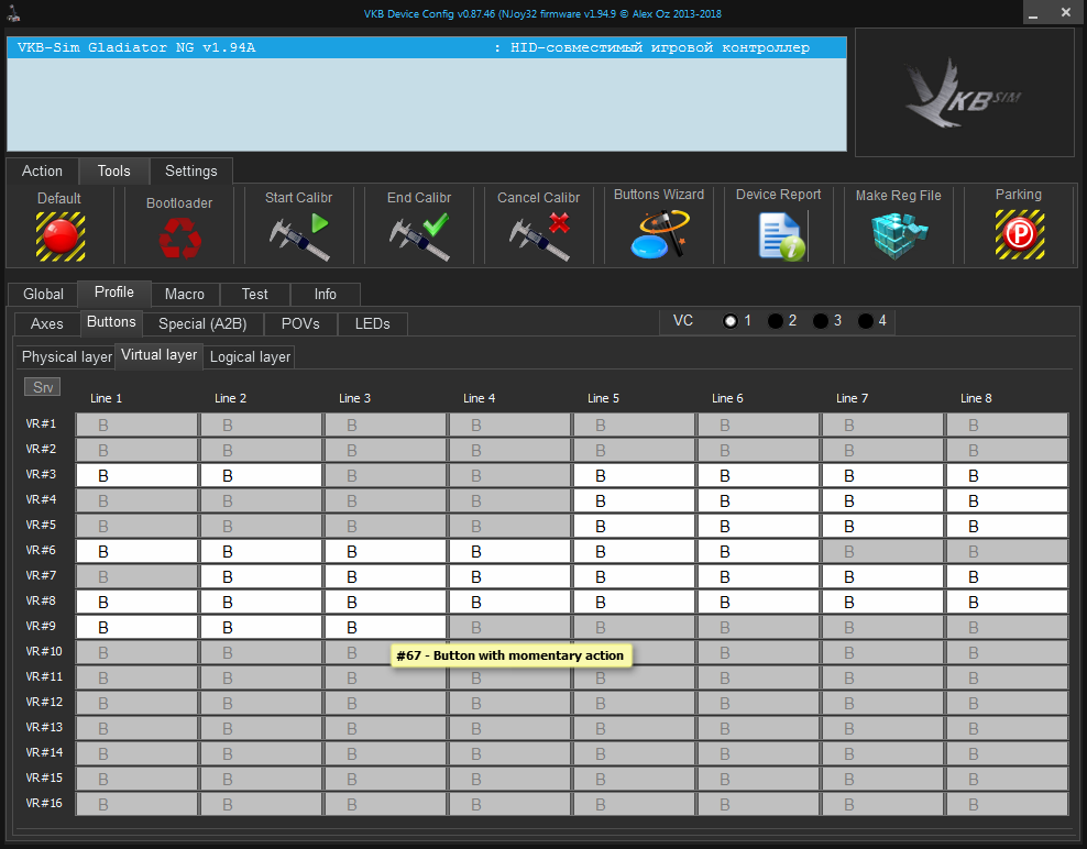 Boris185 Опубликовано: 2 августа 2018 Опубликовано: 2 августа 2018 Всем привет! Получил сегодня ручку MCG, не Про для Гладиатора. Очень нравится! Установил, прошил крайней прошивкой v. 1.94D в конфигураторе 0.87.05, откалибровал. Возникли проблемы: на откидном курке не срабатывает вторая кнопка. Её не видно ни конфигураторе, в режиме Poll, ни в VKB btn.tester. Так же не получается настроить министик " УПРАВ СТРОБ" как оси. Определяется как 4 кнопки. Пытаюсь разобраться, но не очень получается.