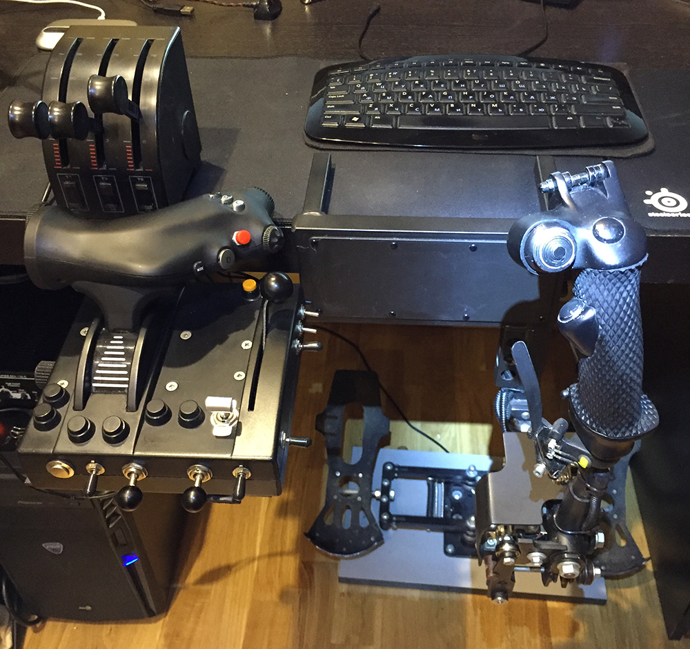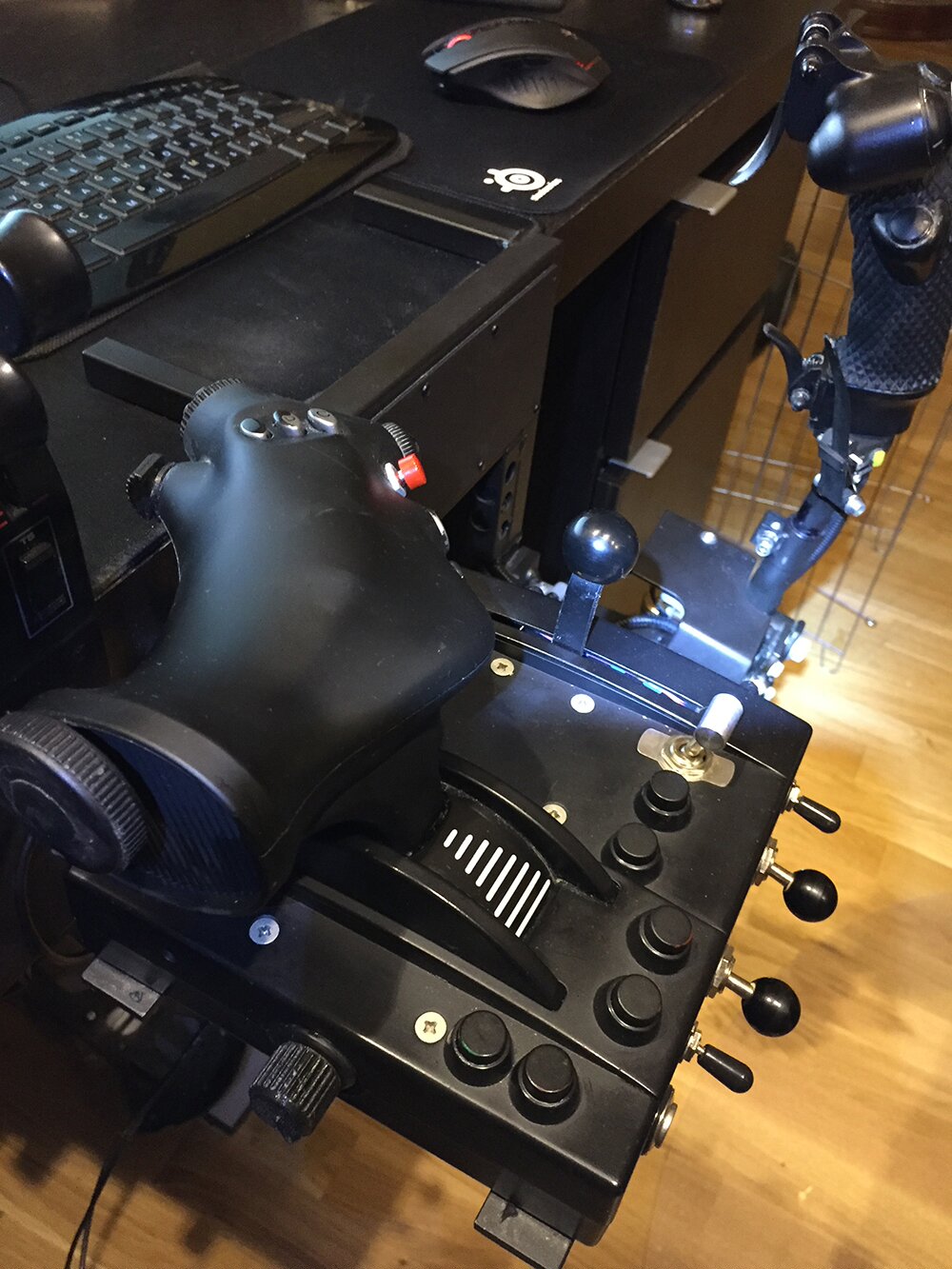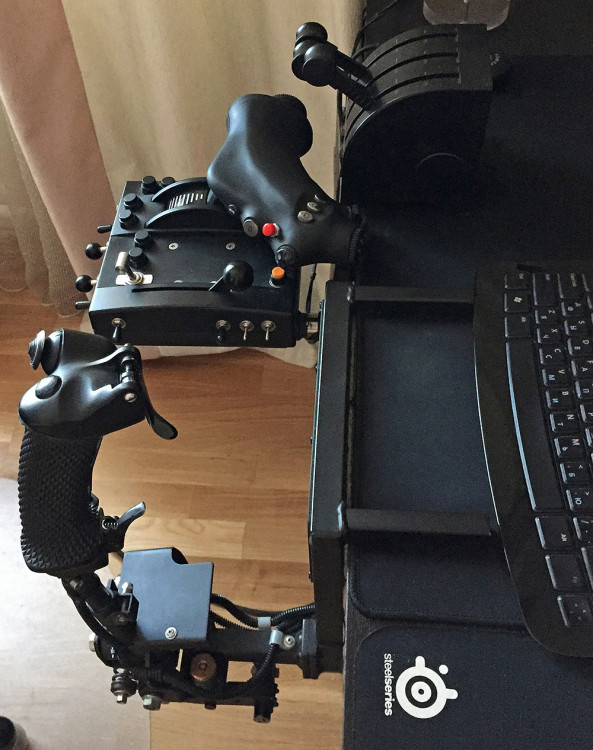 FavN Опубликовано: 22 мая 2018 Автор Опубликовано: 22 мая 2018 Предложение актуально: РУС - полностью механический моноблок - авторская работа уже известного механика мастера Николая + Ручка - копия ручки KG-13 + более эргономическая модификация охвата кистью руки + добавление пары кнопок и авиационной 4-х позиционной хатки. Оси имеют регулируемый "на лету" плавный и очень точный ход. РУС оборудован регулируемой площадкой для РУДа и для крепится к столу струбциной. Имеет высокоточный контроллер "от Кремля" и интерфейс по USB. (Стоимость 25 тыс. руб.) РУД - представляет собой полную модификацию РУДа Геймтрикс. От Геймтрикса остался практически корпус с ручкой и 3 кнопки. Основная ручка + Дополнительный рычаг поставлены на механические оси. На корпус добавлены резисторы, тумблеры и специальные "щелкающие" кнопки. На ручку поставлена двухпозиционная хатка + дополнительные кнопки. Контроллер заменен на "ардуиновский". Полностью настраиваются все оси, тумблера и кнопки. Корпус крепится на подставку моно-блока РУСа. Имеет свой интерфейс по USB. (Стоимость 6 тыс. руб.) Квадрант Сайтек. 3 рычага на 3-х осях + 3 двух-позиционых переключателя. Квадрант в заводской комплектации. Все работает. (Стоимость 3 тыс. руб.) Педали одноосные механические AVASIM Control. От себя добавлены дополнительные съемные пружины и резиновые стельки для удобства и анти-скольжения ступней ног. Педали имеют свой интерфейс по USB. (Стоимость 6 тыс. руб.) Все находилось в работе, бережном отношении и на данный момент в идеальном состоянии. К РУСу и РУДу имеются запасные резисторы, кнопки, тумблера как комплект НЗ. Дополнительные ссылки на фото: https://cloud.mail.ru/public/5cwy/6yAQcf6NJ https://cloud.mail.ru/public/EDDR/GuE5SAFSX Кто заинтересовался, просьба писать в личку или по емейлу: s_larionov@mail.ru 1