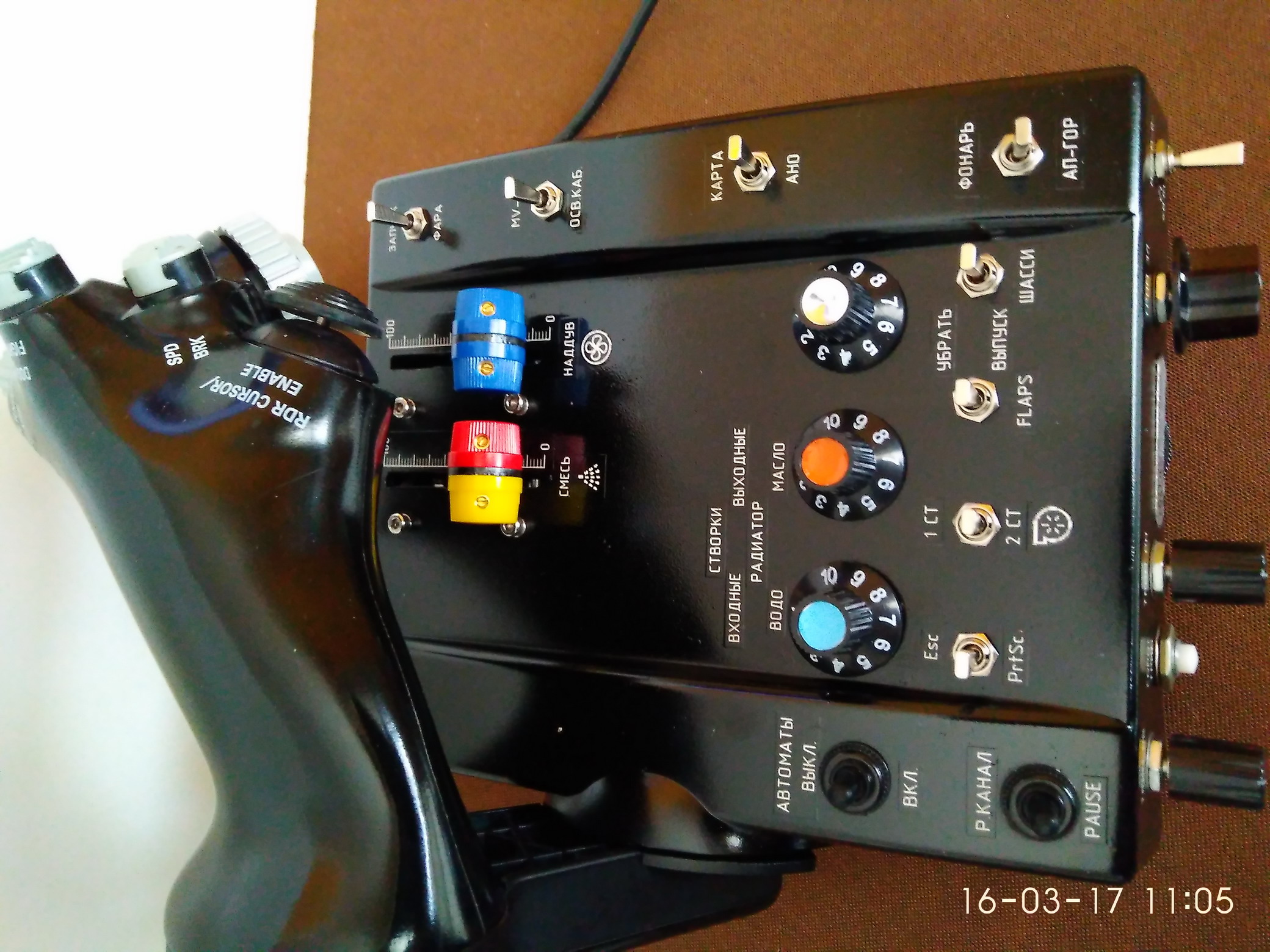 Gelmec Опубликовано: 13 июня 2018 Опубликовано: 13 июня 2018 Родной контролер отвечает за ручку РУД-а, а дополнительный стоит mjoy16.отвечает за остальное. ручка с тремя своими профилями и крутилками и mjoy116 4 тумблера на (ON-OFF) 4 тумблера на (ON-OFF-ON) 1 тумблер на (ON-OFF-ON) с возвратом в центр 4 кнопки 4 оси (крутилки) коробочка из метала 1.5 мм. порошковая покраска! А остатки, поменял на бутылку Коньяка)) 1