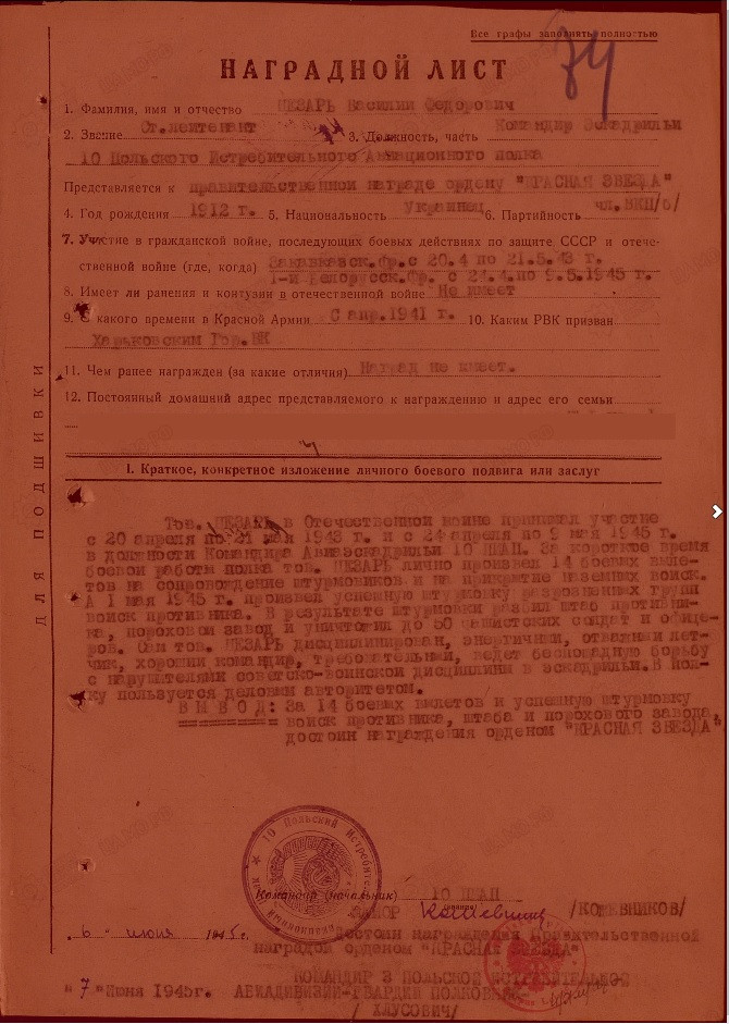 Gennady_Zhekov Опубликовано: 21 июля 2018 Опубликовано: 21 июля 2018 Уважаемые разработчики! Я знаю, что вы имеете доступ к архивным документам (по крайней мере знаете где и как найти). У меня к Вам нижайшая человеческая просьба: помогите восстановить информацию о дедушке моей супруги. Звали его Цезарь Василий Федорович 21.05.1912 г.р. Закончил Харьковское летное училище, по-моему 2й выпуск. Был инструктором, далее служил в 10-м ПИАП, учил и прикрывал на боевых заданиях польских лётчиков. Участвовал в Берлинской операции. Далее 16-я Воздушная армия. Наград у него было очень много, в том числе высшие польские. Практически вся его служба после 1945 засекречена (да и до 1945 много неизвестного). Очень Вас прошу, если есть возможность помогите восстановить ЛЮБУЮ информацию о его службе. Заранее благодарен!