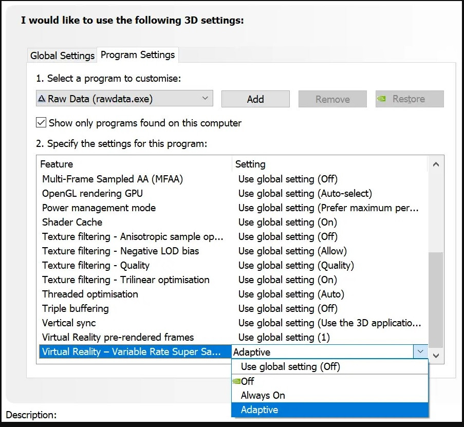 Antony99 Опубликовано: 23 октября 2020 Опубликовано: 23 октября 2020 Это не то,это VR сглаживание, оно отношение к Пимаксу с FFR не имеет. На 8кх просто включаешь FFR в Питтул и все. А для какого приложения ты хочешь VR сглаживание в драйвере включать ил2 и ДЦП не поддерживает его. 27 минут назад, Grivus сказал: здрасти, приехали- для начала его надо включить в драйвере нвидиа это ты с чего взял? 1