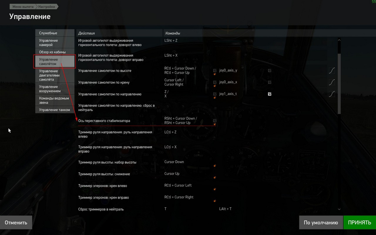 neptun88 Опубликовано: 9 сентября 2019 Опубликовано: 9 сентября 2019 47 минут назад, =SF=Thresher сказал: Вот так выглядит настройка управления переставным стабилизатором по умолчанию. Скрыть содержимое При нажатии Right Shift + Cursor Down (Right Shift + Cursor Up) переставной стабилизатор на внешнем виде перемещается, цифры в окошке в кабине перемещаются, штурвальчик вращается. Во всех случаях техночат показывает %% перемещения переставного стабилизатора. Да, благодарю, я именно это и имел в виду , также переназначал без конфлитов , не работает... Вот ,что написано в стиме в faq'е автор =V=Heromant "Использование Помощника управления мышью В конце 2015 года в игру был добавлен Помощник управления мышью. Это было сделано для снижения порога вхождения в игру. У данного режима есть некоторые особенности и ограничения. Что такое ПМ? ПМ, по сути это "бот" сидящий в кабине Вашего самолета, которому Вы указываете куда лететь посредством мышки. При этом вы показываете точку пространства, куда вы хотите лететь, а всю работу с органами управления самолетом "бот" делает сам. При этом надо знать, что "доруливание" самолетом с помощью клавиатуры отключено. Т.е. любые кнопки, настроенные на изменение углов рыскания, тангажа и крена в данном режиме заблокированы. Остальные кнопки управления работают как и в режиме управления джойстиком. Соответственно, этот режим больше является ознакомительным, т.к. вести серьезный воздушный бой, особенно в сети, при таком режиме управления очень сложно. " Я думаю ,что в этом проблема , если использовать джой +клаву , то все будет крутиться) 2