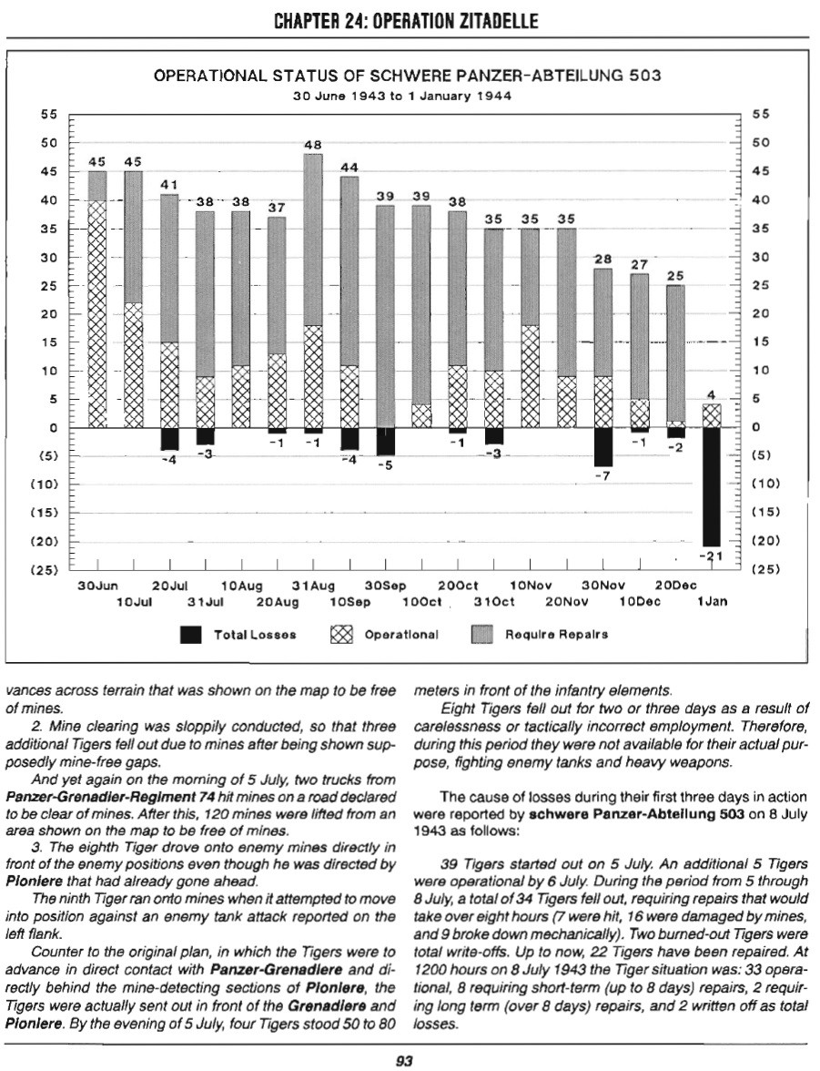 =SF=Age Опубликовано: 16 февраля 2019 Опубликовано: 16 февраля 2019 (изменено) Вот например, данные по техническому состоянию танков 503 тяжелого батальона тигров с 30 июня 1943 по 1 января 1944. Кроме этого страница содержит информацию из рапорта батальона от 8 июля 1943 года: 39 из 45 Тигров было боеспособно на 5 июля. Дополнительно 5 Тигров стало боеспособно 6 июля. За период с 5 по 8 июля всего было выбито 34 Тигра, время ремонта которых более 8 часов (7 подбиты, 16 повреждены минами, 9 с механическими поломками). Два сгоревших Тигра списаны полностью. На текущий момент 22 Тигра были отремонтированы. На 12 часов 8 июля ситуация с Тиграми следующая: 33 боеспособны, 8 требуют короткого ремонта (до 8 дней), 2 требуют длительного ремонта (более 8 дней), и 2 списаны в общие потери. Изменено 16 февраля 2019 пользователем =SF=Age