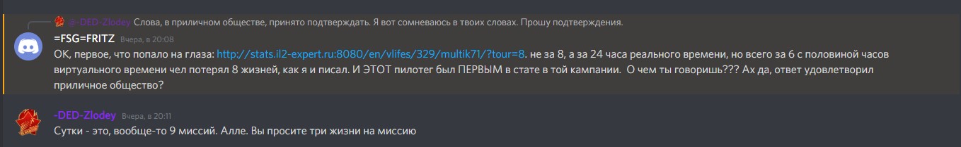 ты имеешь полное право трактовать так, как тебе показалось. как и я, собственно. странно, правда, что тебе не приходит в голову, что человек может ошибиться, либо неправильно тебя понять. у тебя все - прямо, а шаг в сторону - расстрел. я это уже понял, можешь не повторяться. Касаемо же сабжа, вокруг которого тема поднялась - там имеет значение не то, сколько прошло реального времени. и даже не то, сколько - виртуального и на протяжении скольки миссий он потерял эти 8-или 9 жизней. А то, сколько у него в среднем длится виртуальная жизнь. от 5 минут, до 3,5 часов. В среднем - 20-30 минут. Если бы он не делал пауз - то за 2,5 часа это потеря 5-ти жизней, не трех, а почти вдвое больше. Вот что я тебе хотел рассказать, жаль, возможности нестало. И при этом он у тебя - "лучший"? Какой интерес здесь летать, если это "лучший"? Я сегодня с ним разговаривал - там куча чисто технических проблем. С джоем, педалями, етц. Но кому это интересно - чужие проблемы? Сервер для всех и очень было-бы хорошо, чтобы БОЛЬШИСТВУ он был интересен.
