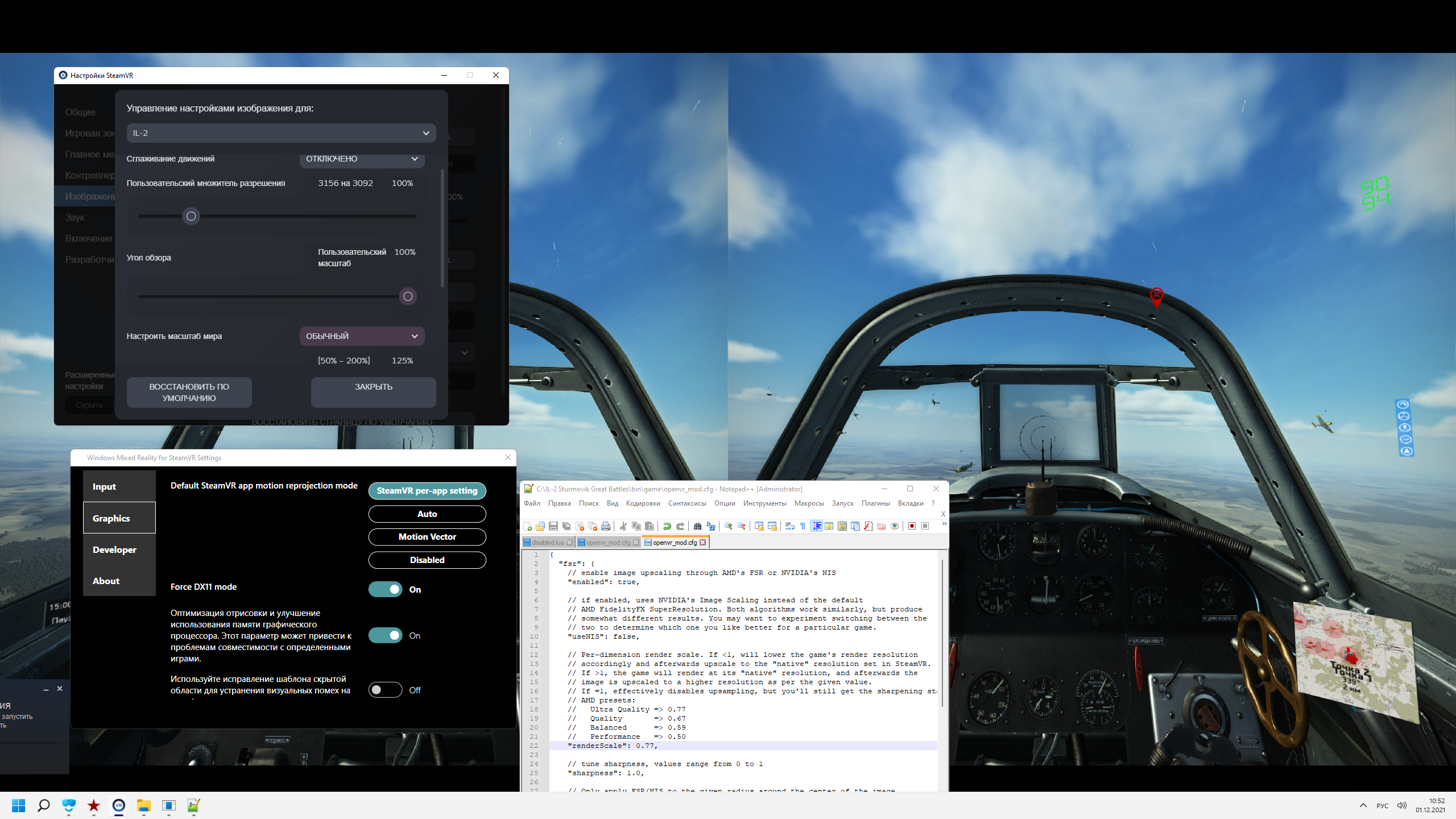 Minotavrik Опубликовано: 30 ноября 2021 Опубликовано: 30 ноября 2021 (изменено) Всем привет. Напишу все же результаты и первые впечатления ? За неделю достиг ситуации что по 45 кадров и в Иле и в ДКСе на Ми8. Дальше настраивать просто нет сил. Вроде более и менее плавно, хотя и не очень комфортно конечно. Интересно - покупка например 3080 Ti кардинально сменит ситуацию? Вообще какие мощности то этому шлему подавай? Или таких в природе пока нет? При этом конечно в настройках пришлось поставить 50% на Ил 2 - при этом картинка за бортом так себе, уверенное видение наземки дальше 1000 м примерно невозможно, с конами примерно так же - я как вижу много красочных и жирных мух - оценить тип получается только с метров 500 примерно =)) короче воевать с такой картинкой занятие так себе конечно ? Кстати - объясните пожалуйста смысл Reprojection Ratio- что это за зверь? А так первое впечатление конечно ВАУ!!! - правда на первый день после примерно 2 часов настроек и полетушек - из-за компа вылез светло-зеленого цвета с явными позывами позвать ихтиандра ? Потом вроде как попривык - но бочки пока не кручу - ну его нафиг ? Подозреваю что данный эффект еще и от не очень большого количества кадров у меня. Но как на 2080 Super получить хотябы стабильные 60 кадров не знаю... Поэтому хотелось бы чтобы знающие люди просветили в плане видеомощностей 3080Ti смотреть или уж сразу на 3090 резать карман (что конечно не хотелось бы при текущих ценах) Насколько например наличие 24 Gb видеопамяти оправдано и нужно для VR на 3090 - потому что на 3080 Ti 12 Gb - разница в 2 раза. 21 час назад, Rouslan сказал: Вроде как сделан облегченный интерфейс и возможность запуска SteamVR без запуска WMRпортала - типа ресурсы меньше жрёт. Должно было встать с обновлением 21H2. Обновился давно, но в упор не вижу изменений. А в параметрах-смешанная реальность должна появиться дополнительная настройка для SteamVR. Видел картинку у буржуев. Обновление поставил - изменений не обнаружено. Все так же. Грузится и SteamVr и WMR -при попытке WMR погасить, отрубается и SteamVR Изменено 30 ноября 2021 пользователем 72AGs_Minotavrik