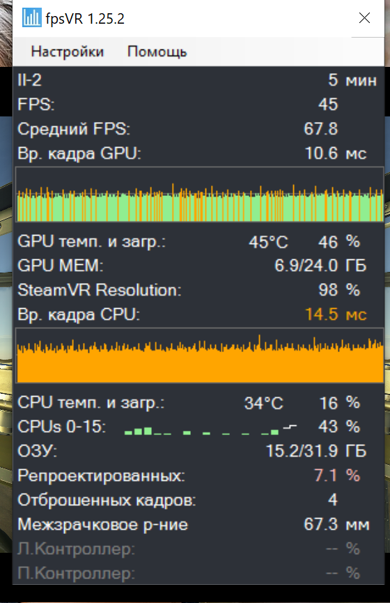 VladZ70 Опубликовано: 13 сентября 2022 Опубликовано: 13 сентября 2022 1 час назад, Drakon сказал: Комп: Мать -h370 gaming plus Проц - i9 9900k Видео - GTX 3090 дрова самые последние оперативка - 32Г шлём G2 запускаю через openXR винда 10 бьюсь с настройками ИЛа... неужели этого железа недостаточно для комфортной игры? проц разогнал по максимальным попугаям в CPUz - 540 один поток 5800 общий проц. 3090 особо не гонится - совсем чутка настроил настройки ИЛа в одиночном вылете "высокие" на стабильные 90ФПС - все плавно и качество приемлемо. стоит запустить карьеру - 50-70 ФПС и периодически подлагивает, чем больше бортов перед мордой тем хуже, если идти впереди своей колонны, то все снова норм - 90 ФПС (если отключить все подсказки). в одиночном вылете HUDы ФПС не садят. пользуюсь недавно, ощущения двоякие - первые 2 дня просто рассматривал все доступные кабины! чувство полета супер! но разрешение и видимость просто удручает (такое ощущение, что смотриш на первый TFT монитор) на снегу еще хоть чего то видно, на темной земле в упор не видно... приходится летать с кратковременно включаемыми маркерами, что не гут - накорню портит весь реализм. проштудировал форумы ила и dcs на предмет производительности, перепробовал всякие советы - особо ни чего не помогло... может кто чего присоветует у кого похожее железо? говорят драйвер на видюху сильно влияет на производительность, пробовал какие советовали - так они вообще не устанавливаются... Мать -Z690 Проц - i7 12700kf Видео - GTX 3080ti дрова самые последние оперативка - 32Г шлём G2 запускаю через SteamVR винда 11 Попугаи в CPUz - 840 один поток 10500 многопоток. В карьере с большим количеством юнитов 90фпс. Драйвер обезжирен "NVCleanstall". Очевидно проблема в процессоре. Настройки ниже. Про четкость как на мониторе забудь.