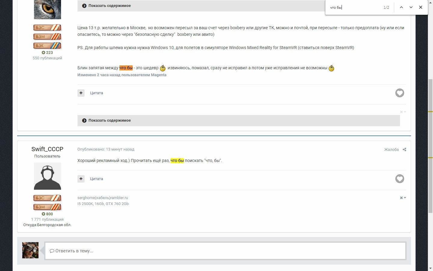 Magenta Опубликовано: 24 апреля 2019 Опубликовано: 24 апреля 2019 (изменено) Брал на пробу, мне не пошли, остался на Oculus-e, но может кому хочется попробовать VR, для начала что, бы прочувствовать VR само то. Мало юзаные, набор без тачей , но для симов они как раз и не особо нужны. Скрытый текст Цена 13 т.р. желательно в Москве, но возможен пересыл за ваш счет через boxbery или другие ТК, можно и почтой, при пересыле - только предоплата (ну или если опасаетесь, то можно через "безопасную сделку" boxbery или авито) PS. Для работы шлема нужна нужна Windows 10, для полетов в симуляторе Windows Mixed Reality for SteamVR (ставиться поверх SteamVR) Блин запятая между что бы - это шедевр извиняюсь, помазал, сразу не исправил а потом уже исправления не возможны Изменено 24 апреля 2019 пользователем Magenta