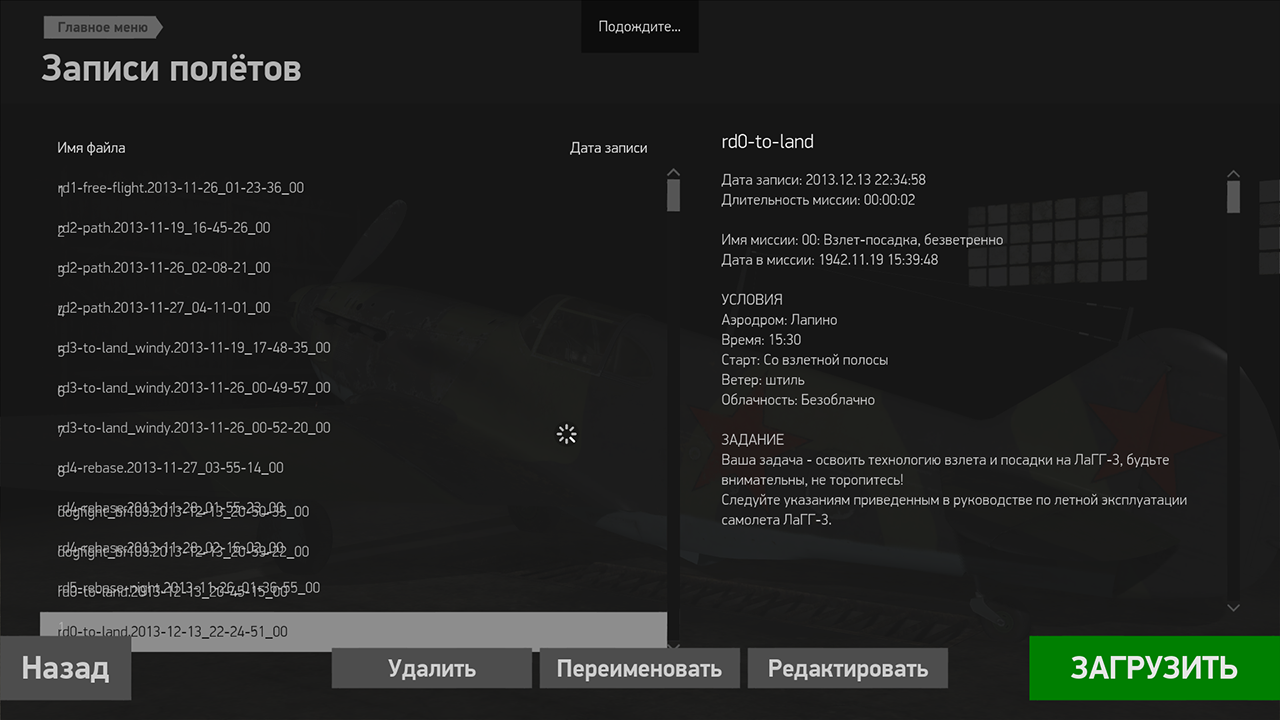 1CGS BlackSix Опубликовано: 13 декабря 2013 1CGS Опубликовано: 13 декабря 2013 Ранний доступ - неделя №4 На этой неделе мы передаем вам новую версию проекта. Главной темой этой версии являются "Записи полета". Вы можете посмотреть видео, в котором мы рассказываем о том, как именно пользоваться системой записи. Основные органы управления: LCtrl+R - вкл/выкл запись H - скрыть диалог прогресс-бара, и включить управление камерами при просмотре LCtrl+F1 - переключиться на камеру, записанную в треке (камера использованная при записи трека) F1 - камера из головы пилота, воспроизводит движения головы при записи LAlt+F1 - свободная камера в кабине, направление может быть изменено в процессе просмотра Список изменений: Добавлен функционал записи игровых треков Исправлены установки качества текстур земли Исправлены установки качества теней Исправлено пропадание самолета в воздухе при смерти пилота Исправлена работа компаса на ЛаГГ-3 Добавлены новые звуки попаданий Исправлено появление двойного самолета игрока на старте миссии Исправлен сброс настроек инверсии осей, скорости мыши, настроек фидбека при повторном запуске игры Добавлен звук открывания фонаря кабины P.S. Обратите внимание: При просмотре треков, после переключения между камерами F1 и F2 начинаются проблемы с записанным в треке зумом и обзором, что делать?Переключение на камеру F1 воспроизводит только движения головы пилота при записи, игнорируя зум.Чтобы переключится на обзор, полностью совпадающий с записанным в треке, нужно нажать LCtrl+F1. Если после открытия доступа у вас возникнут сложности с обновлением, ознакомьтесь с этой темой Что делать при проблемах с обновлением? Доступ будет открыт в пятницу 13 декабря в 23:59 по московскому времени и продлится до 23:59 16-го декабря 6