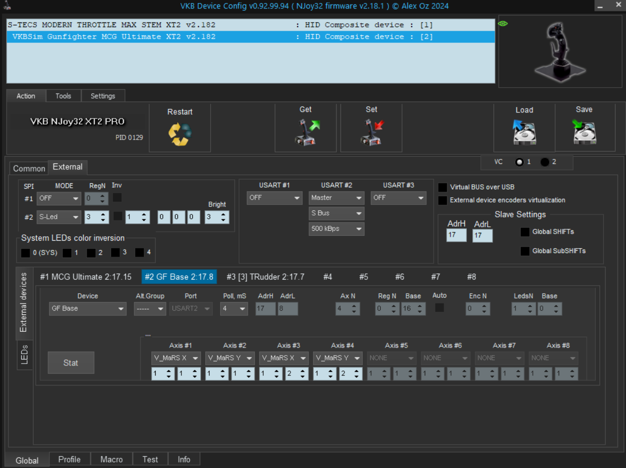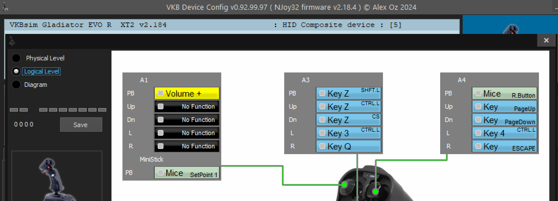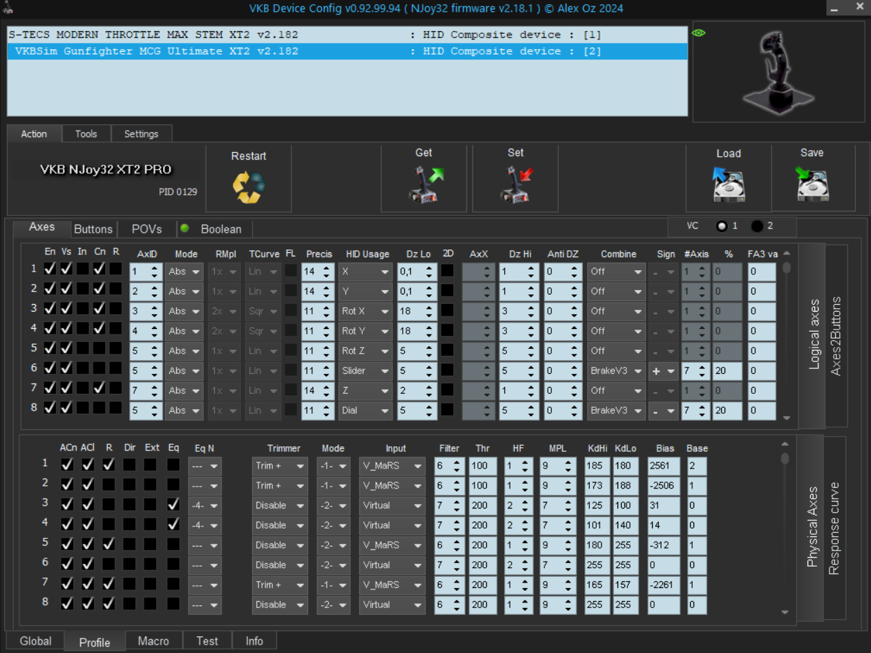 GrayZeeCat Опубликовано: 26 мая 2024 Опубликовано: 26 мая 2024 @Alex_Oz Здравствуйте. GF Mk.IV MCG Pro Twist BB Mk3 Прошивка _BlackBox_Mk3_Unified_v2_18_5.vkb Конфигуратор VKBDevCfg-C_v0.93.00 При перезагрузке джойстика, если в этот момент MCG PRO Trigger в положении Safe, после загрузки на триггере будет работать только физическая кнопка. Конфигуратор и VKB_joytester при этом показывает, что сразу после загрузки устройства на триггере нажаты кнопки Safe, Armed и Fire1. Если перезагрузить джойстик с триггером в положении Armed, то триггер работает корректно. На предыдущей версии прошивки и конфигуратора поведение аналогичное. Еще вопрос, про текущую реализацию комбинирования осей. Как работают Combi1, Combi2, Dif1, Dif2, что регулирует поле %? Описание в инструкции с тем, что сейчас получается в конфигураторе, не совпадает. Меня бы вообще ответ в виде формул устроил, по которым рассчитывается новое положение центра и отклик зависимой оси, для каждого варианта. VKBSim Gunfighter Modern Combat Pro profile 1.rar