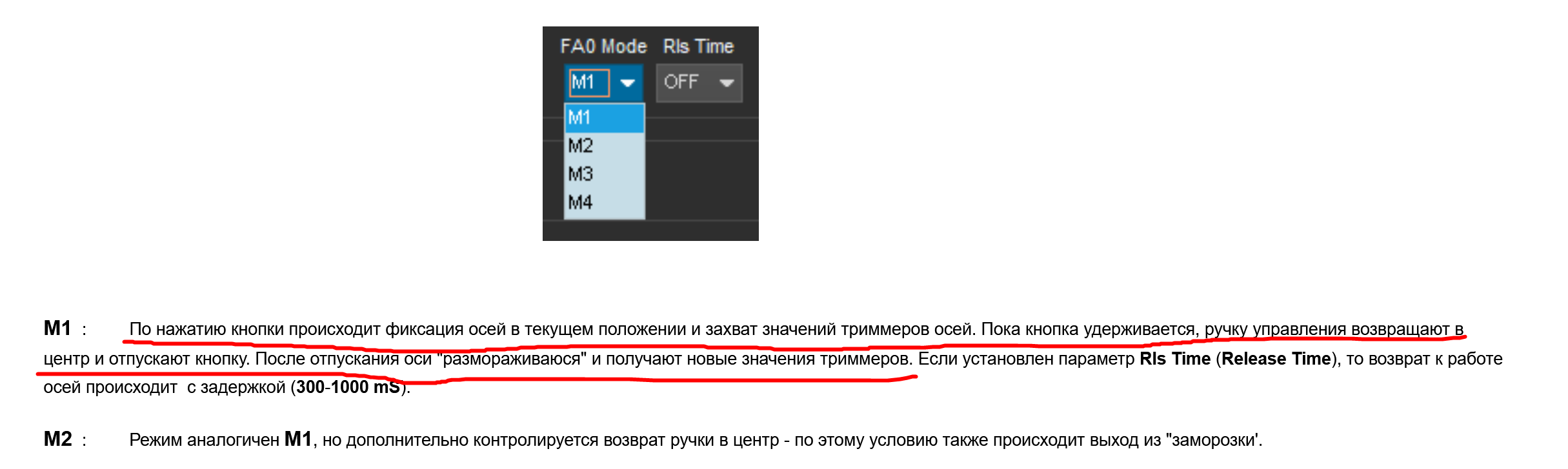 aero4000 Опубликовано: 13 апреля 2024 Опубликовано: 13 апреля 2024 20 минут назад, Alex_Oz сказал: Вот правильный пример запроса: Если это мне, то извините, я не смог сразу правильно подобрать формулировки. Наверное. Суть проста: Надо сделать "вертолетное триммирование" основных трех осей (крена, рыскания и тангажа) при котором фиксируется (замораживается) текущее положение осей в качестве центров, пока ручка и педали не будут возвращениы в свои физически нейтральные положения и/или по истечении заданного времени. После чего возобновляется нормальное управление. Судя по информации из инструкции и хелп центра, это достигается при помощи функции физической кнопки Fix_Axes, тип FA0 и глобальной настройки FA0 Mode = M2. У меня получается настройка вертолетного триммера как описано. Но, если я хочу оттримировать только педали, то игнорируется Rls Time, мгновенно удваивается отклонение педалей, не хватает времени для снятия усилий с педалей, происходит ощутимый рывок оси. При этом FA0 Mode = M1 работает в соответствии с заявленным функционалом как положено.