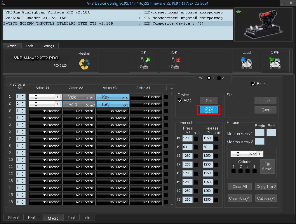 KARDANKA Опубликовано: 13 января Опубликовано: 13 января (изменено) Доброго дня, нужна помощь. Полдня искал возможные ответы, не смог найти. Приобрёл РУд от ВКБ Мини+. Ось газа не определяется в настройках DCS. Ось фиксируется как оси РУС-а. В программе настройки ползунки бегают, как положено, но в миссии РУД-ы не реагируют, реагирует РУС. ПО от ВКБ устанавливал вручную из дистрибутива на сайте: Device Config 0.93.18. STECS XT2 v2.190 Вижу, что надо сбросить какой-то конфиг, но как это сделать подскажите. И ещё, во вкладке Глобал нет серийника и АйдИ, это нормально? Изменено 13 января пользователем KARDANKA Добавление вопроса