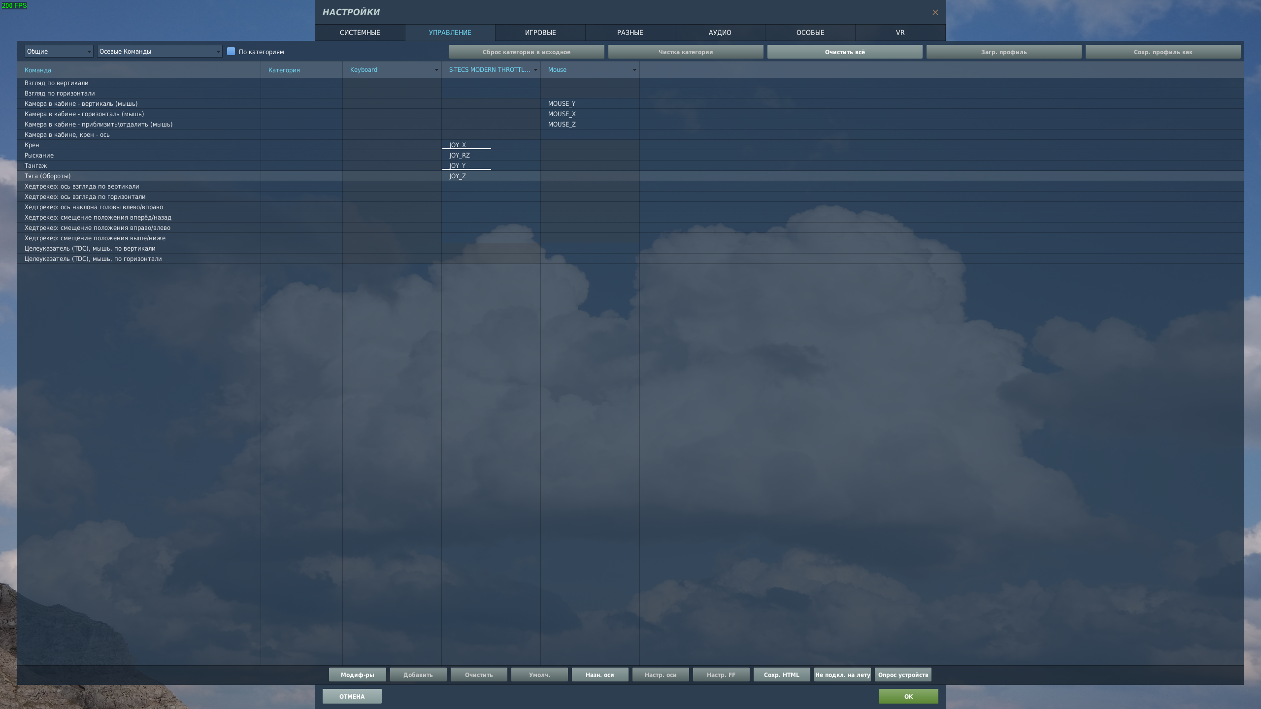KARDANKA Опубликовано: 15 января Опубликовано: 15 января 5 часов назад, GrayZeeCat сказал: Оси надо в самом DCS настроить. Сначала лучше всего очистить категорию, так как по умолчанию DCS весьма произвольным образом контролы джойстиков назначает. Выбрать нужный ЛА, выбрать мышью столбец с нужным джойстиком, нажать "Очистить категорию", потом в осевых командах выбрать нужную ось ЛА двойным кликом и подвигать на джойстике нужную ось, DCS ее подцепит. И так для каждого ЛА. Для однотипных ЛА можно сохранить настройки профиля в файл и потом загрузить для другого ЛА, чтобы вручную все не назначать по новой. Совпадающее управление подтянется, для модуля ГС очень хорошо работает. Так и делал, но определяет осью Y, ругается, что она на Тангаже уже назначена. При движении РУД-а (в главном окне и в миссии), "подсасывется", но параллельно с осью РУС-а. В кокпите не реагирует никак, только осью РУС-а. 12 часов назад, Ty3_B_PyKABE сказал: Такое впечатление, что человек вообще ничего не настраивал. Да, не настраивал, т.к. не понимаю, что именно надо трогать в конфигураторе. Может есть способ скопировать чей-то конфиг?